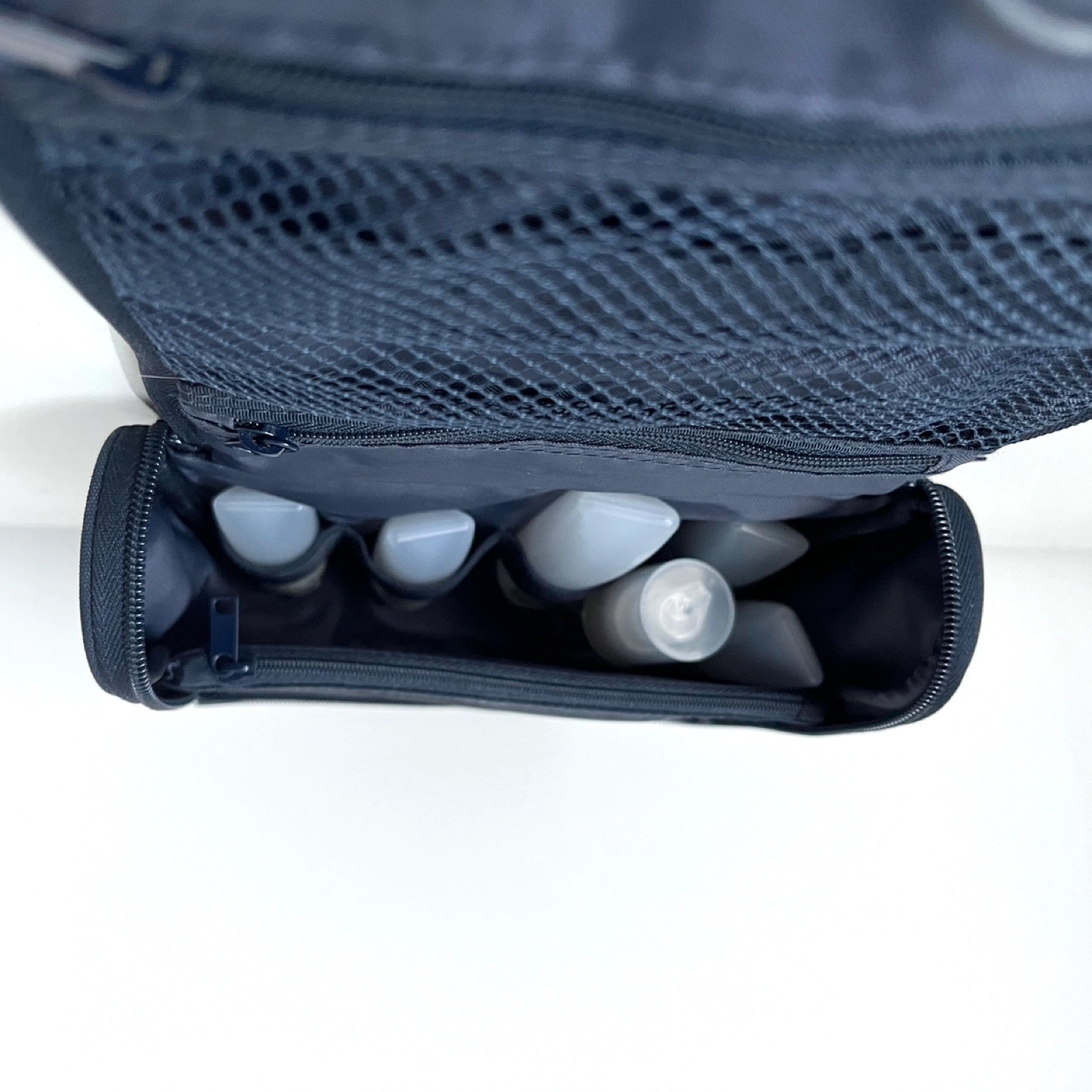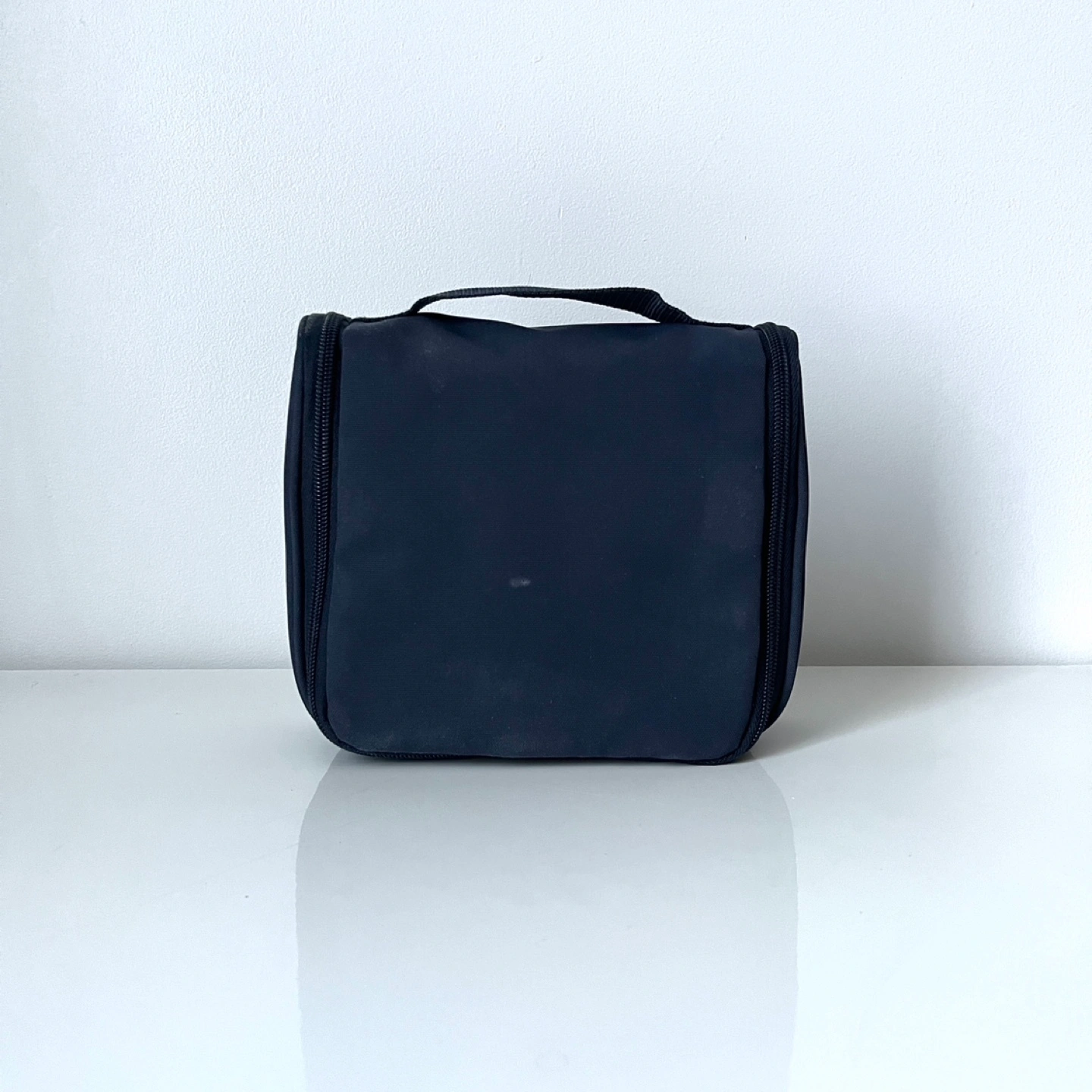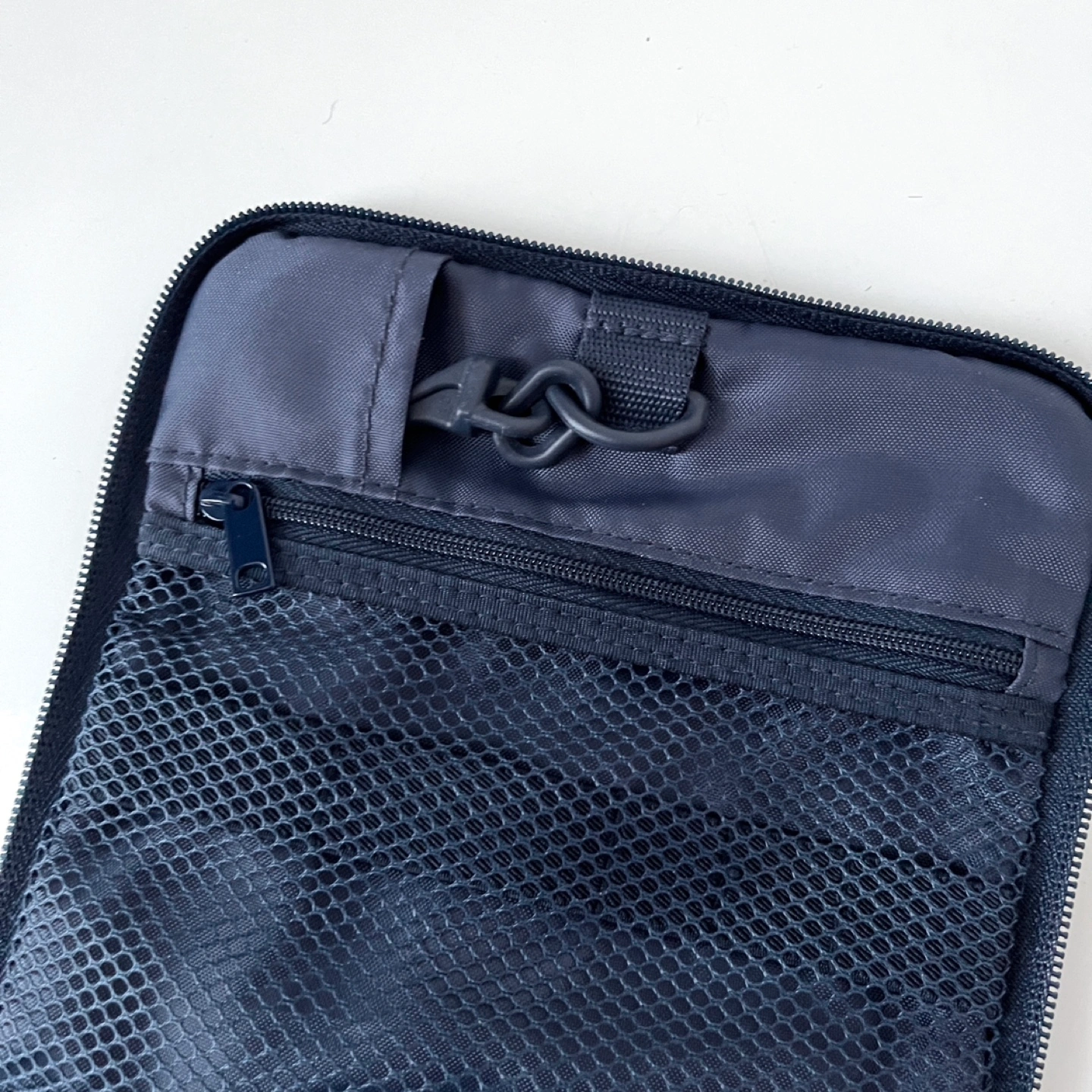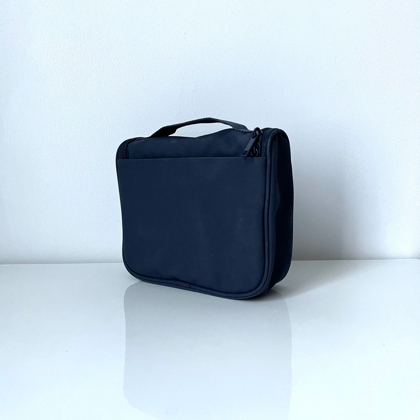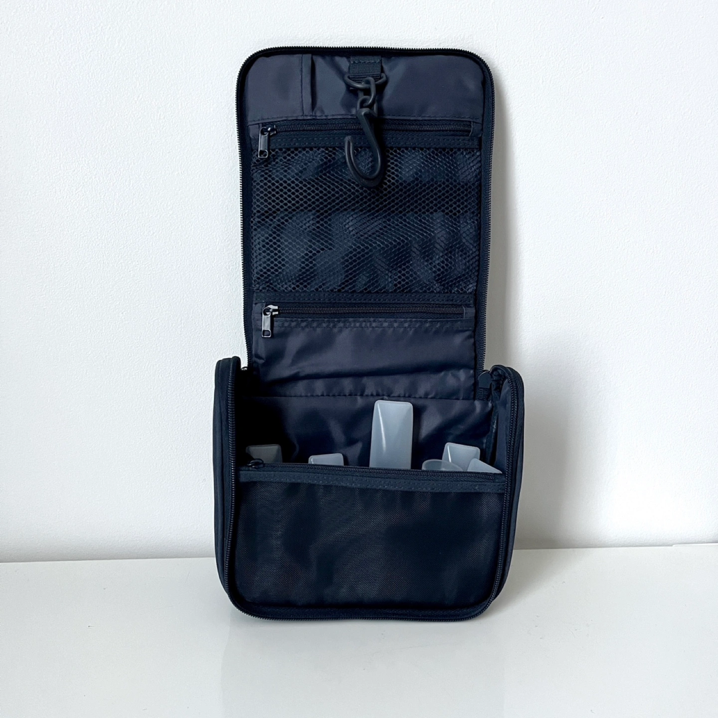 MUJI toiletries bag. 2L capacity. Multiple compartments and zippered closures. Features a hanging loop that tucks away.