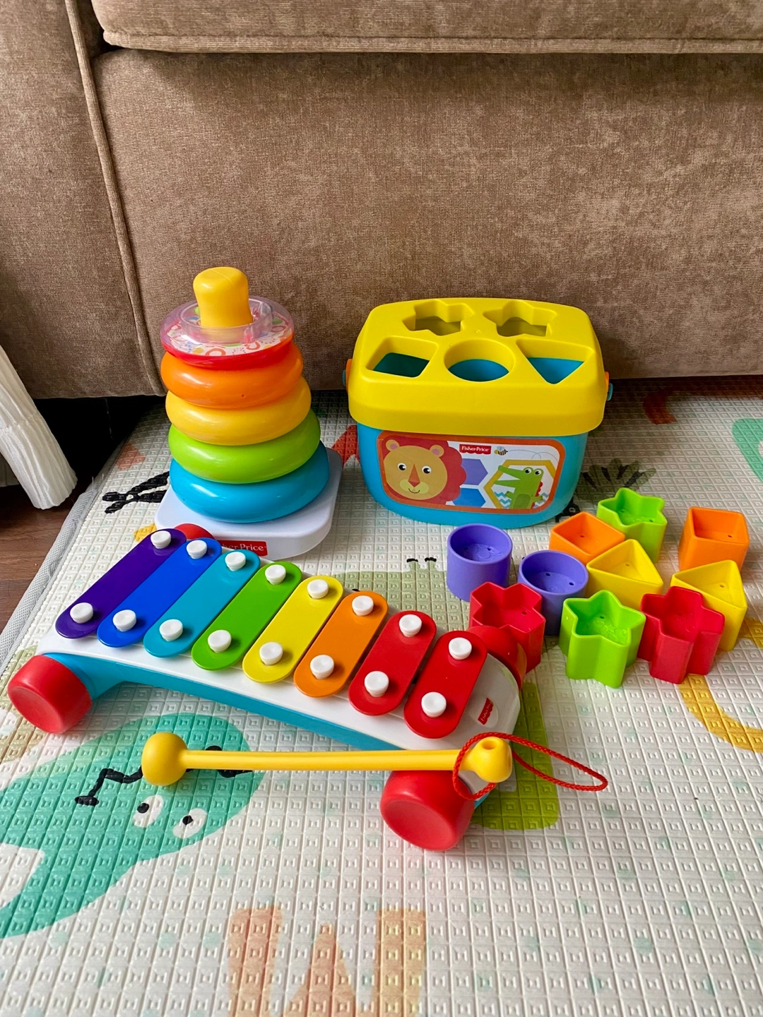 Three colourful baby toys. Stacking rings, shape sorter bucket with extra shapes, and xylophone with mallet. Excellent condition.