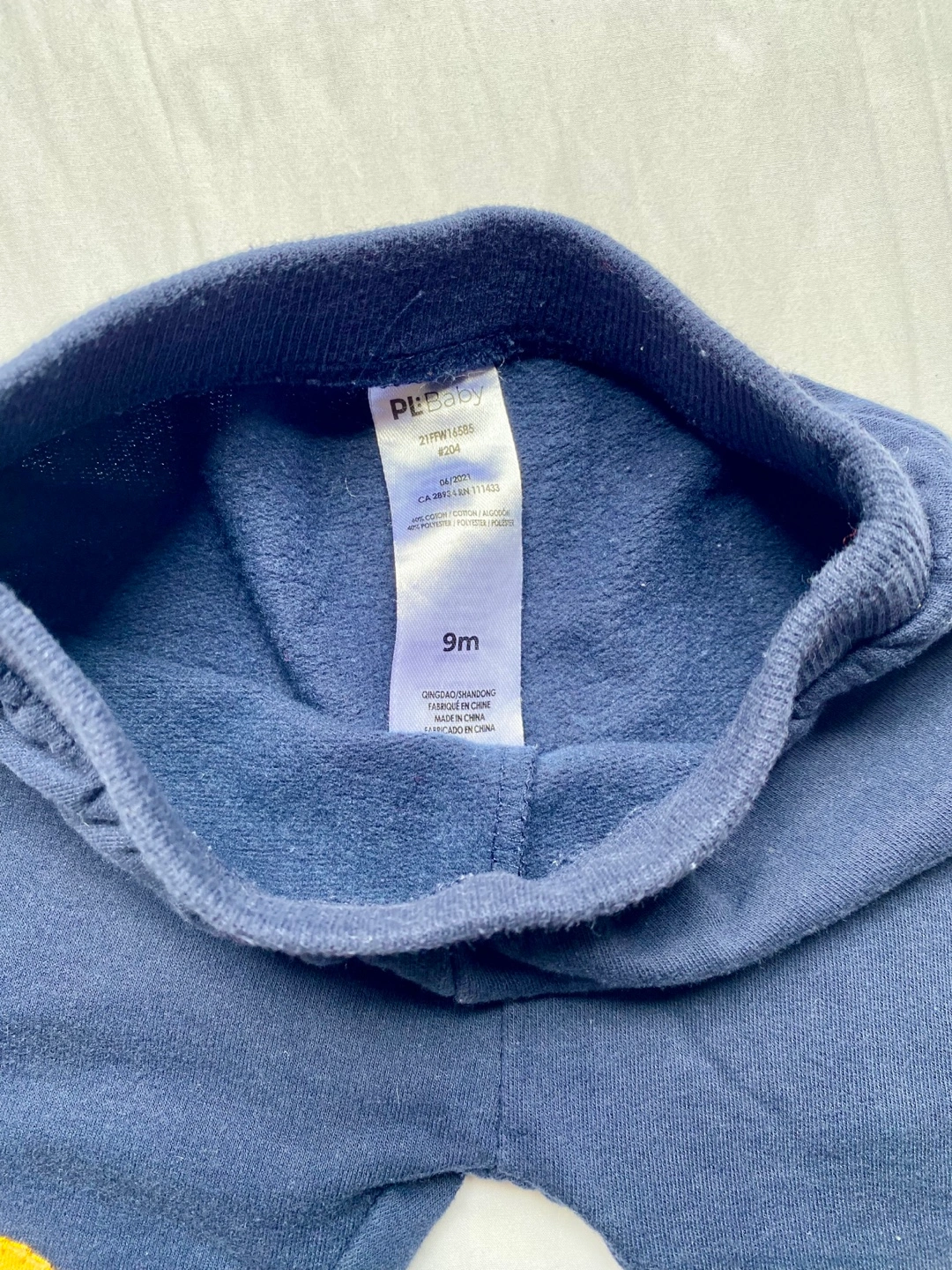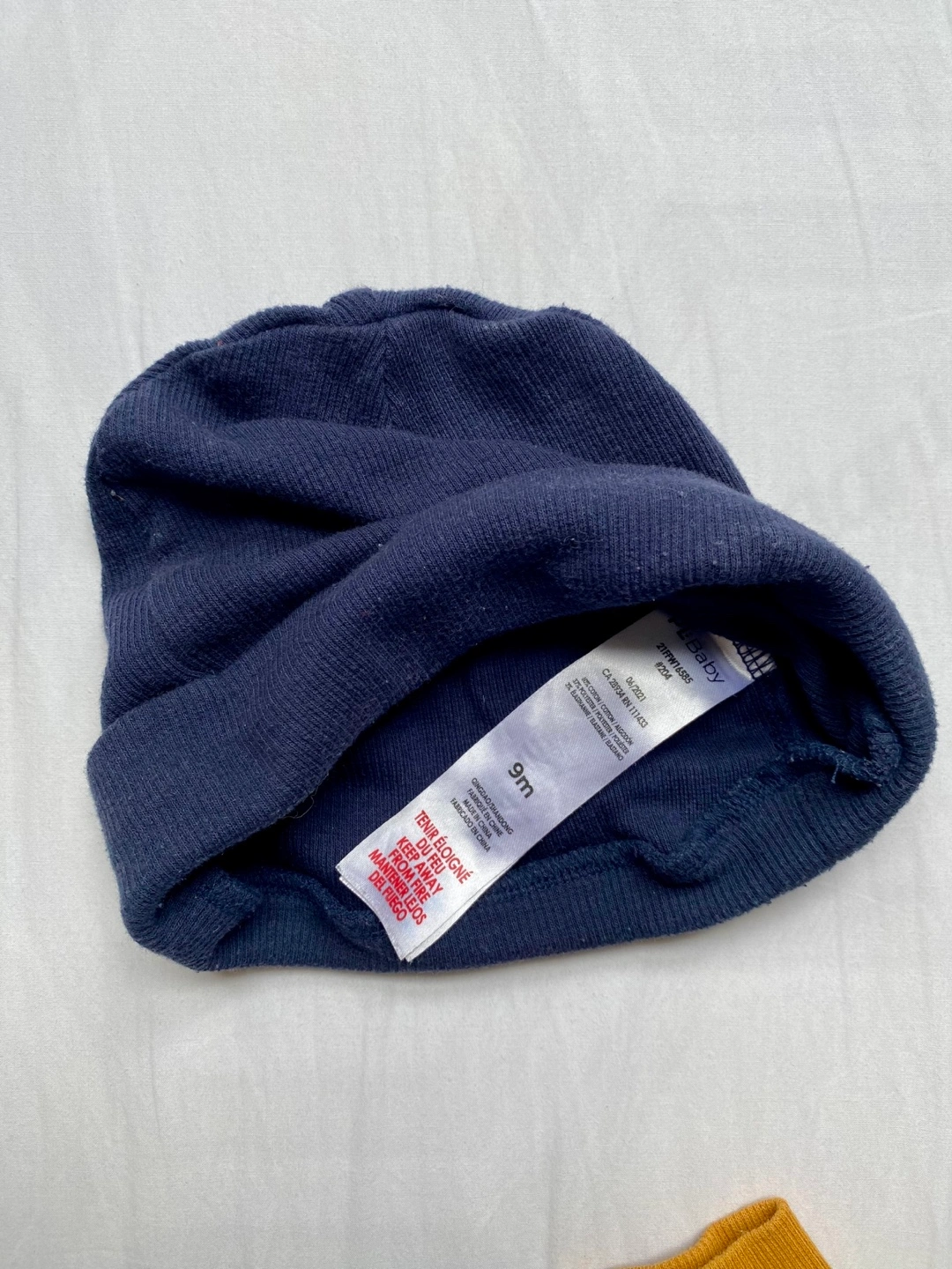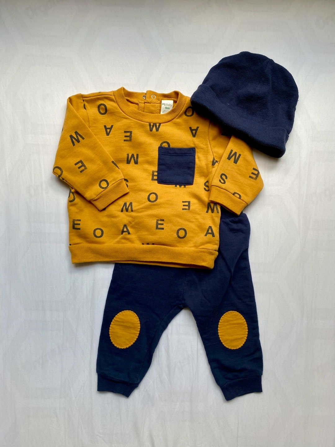 Adorable 3-piece baby outfit. Mustard yellow sweatshirt with letter print, navy blue pants with mustard yellow knee patches, and matching navy blue beanie. Size 9 months. Pick up only, Wilson Heights and Sheppard area