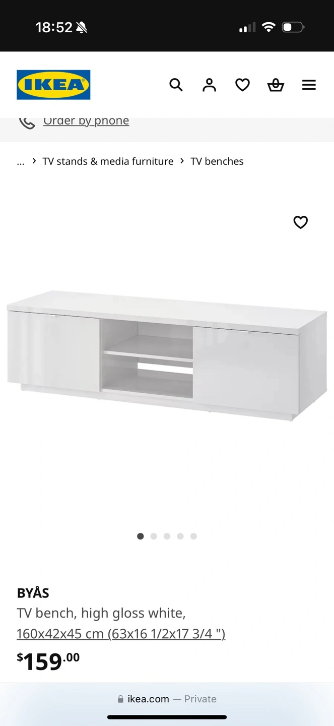 Width: 160 cm (63 ") Depth: 42 cm (16 1/2 ") Height: 45 cm (17 3/4 ") Max load/shelf: 10 kg (22 lb) Maximum load/drawer: 9 kg (20 lb) Max. TV weight: 25 kg (55 lb) Whitby pick up