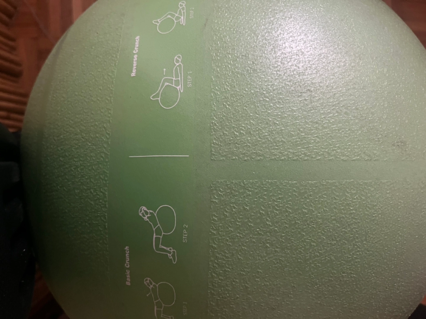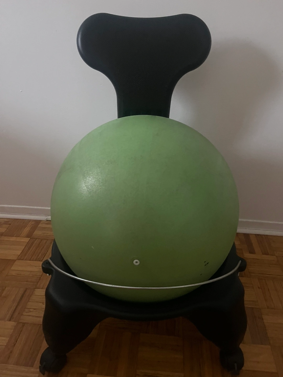 Green exercise ball, anti-burst. Includes black rolling chair base. Instructions for various exercises printed on ball. Good condition.