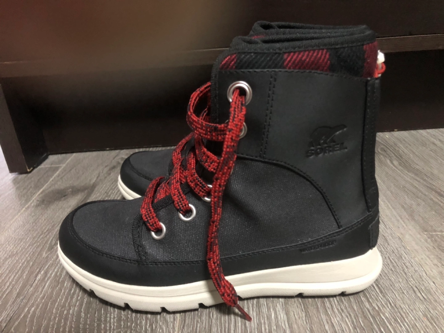Women's Sorel boots. Black canvas with red plaid accents. Lace-up style. Size 7. Faux fur lining. Great for winter.