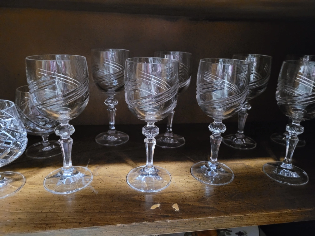 Eight elegant crystal wine glasses. Etched design. Beautiful addition to any table setting.