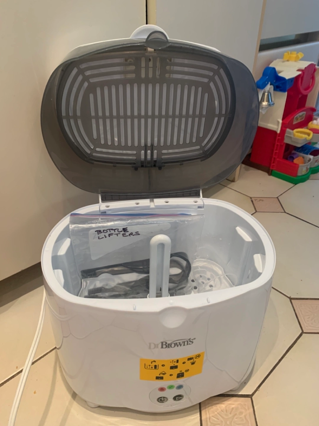 Electric bottle sterilizer. Great for cleaning baby bottles and accessories. Includes power cord and bottle lifters
