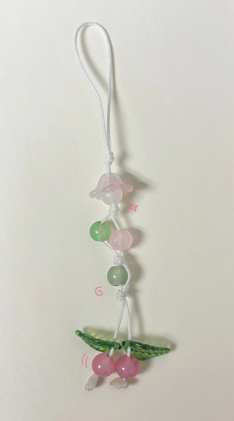 Adorable phone charm featuring pink and green beads, a flower accent, and a cherry design. White cord. Perfect for adding a touch of whimsy to your phone or bag.