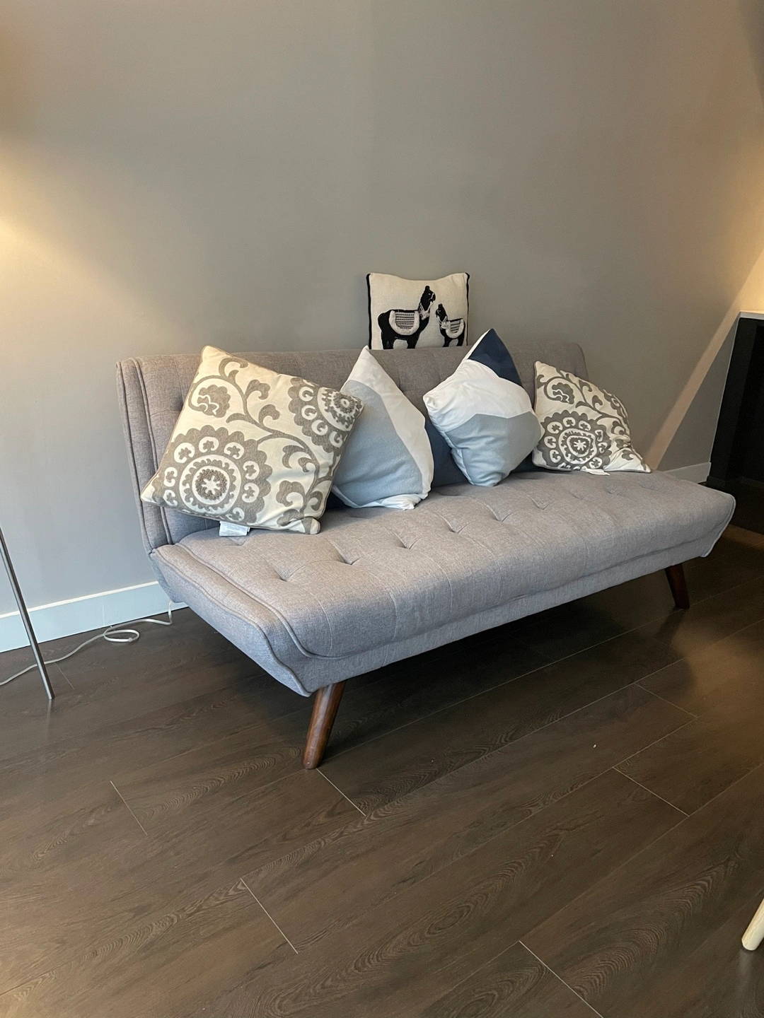 Comfortable grey futon. Mid-century modern style. Wooden legs. Includes four throw pillows. Perfect for small spaces.