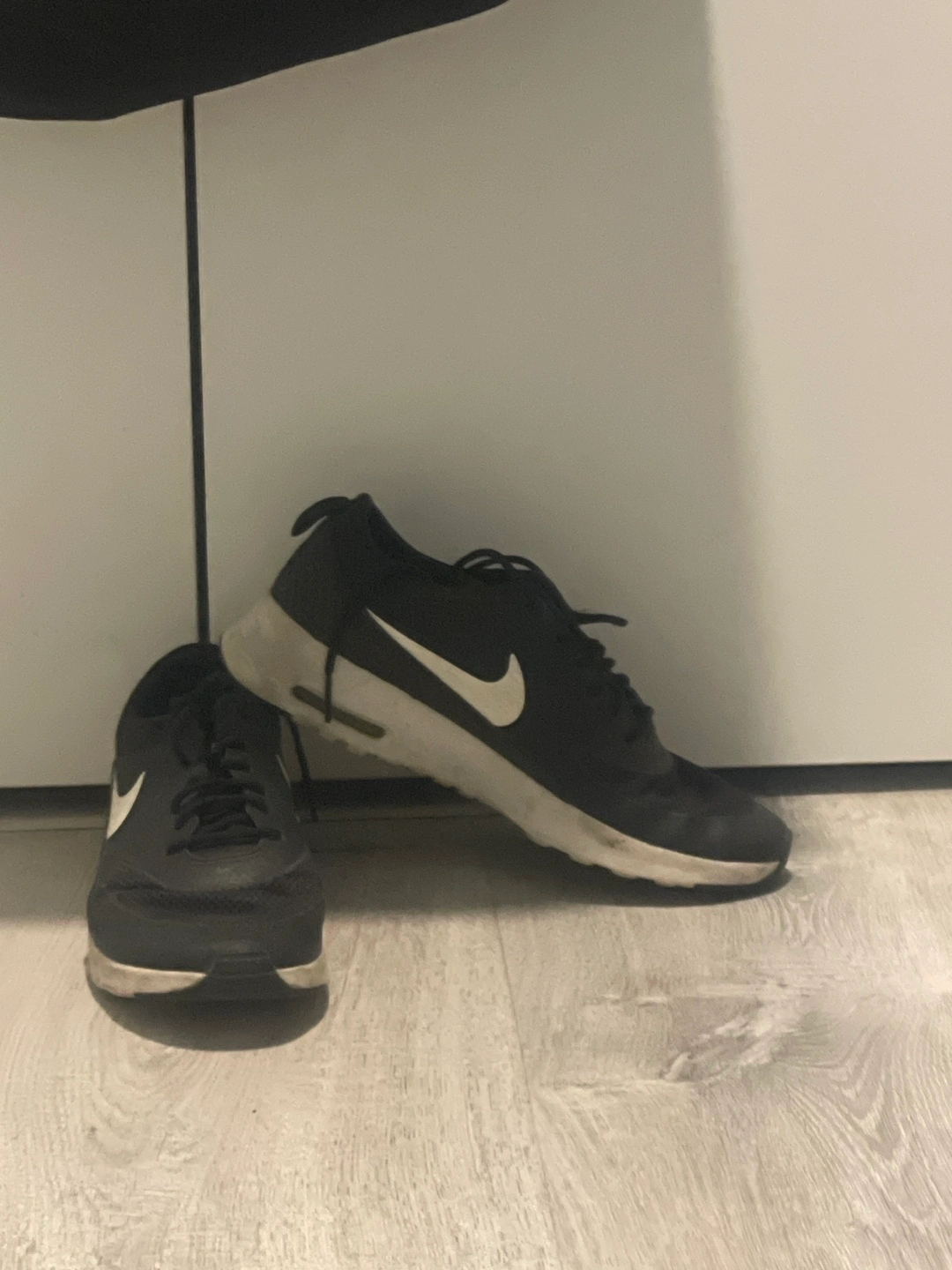 Pair of black Nike Air Max Thea running shoes. Size not specified. Included black Nike gym bag. Good condition. Shoes size 7 W
