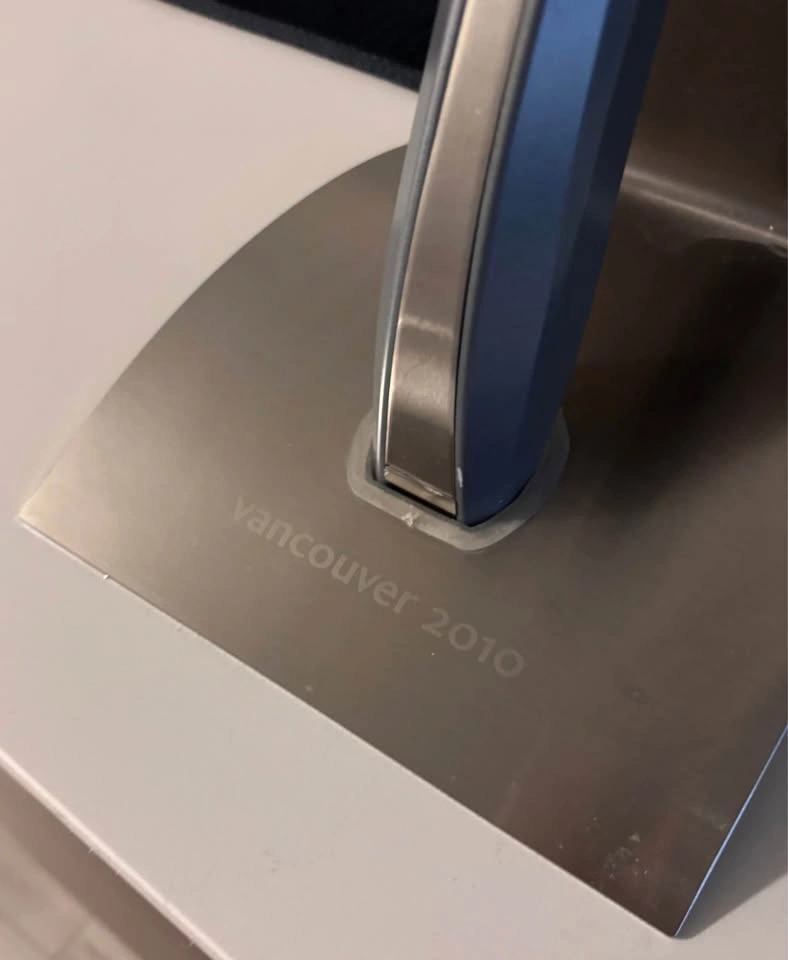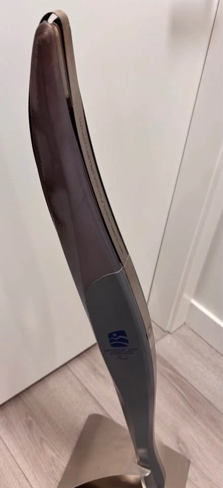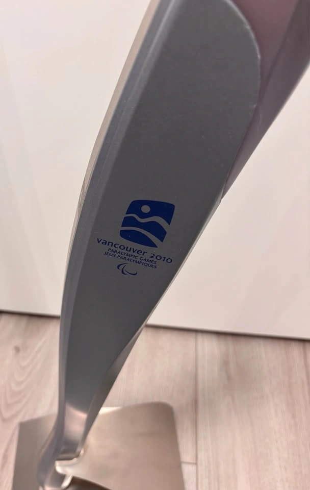 Great piece of Vancouver history! Only about 600 Paralympic torches were created and this is one of them. Original owner and used for relay in Hope BC. Engraved with the motto 'With Glowing Hearts/ Des plus brilliants exploits' with a Canadian maple leaf cut out on the opposite side of the torch. Comes with the original box and carrying bag as well as the torch stand.