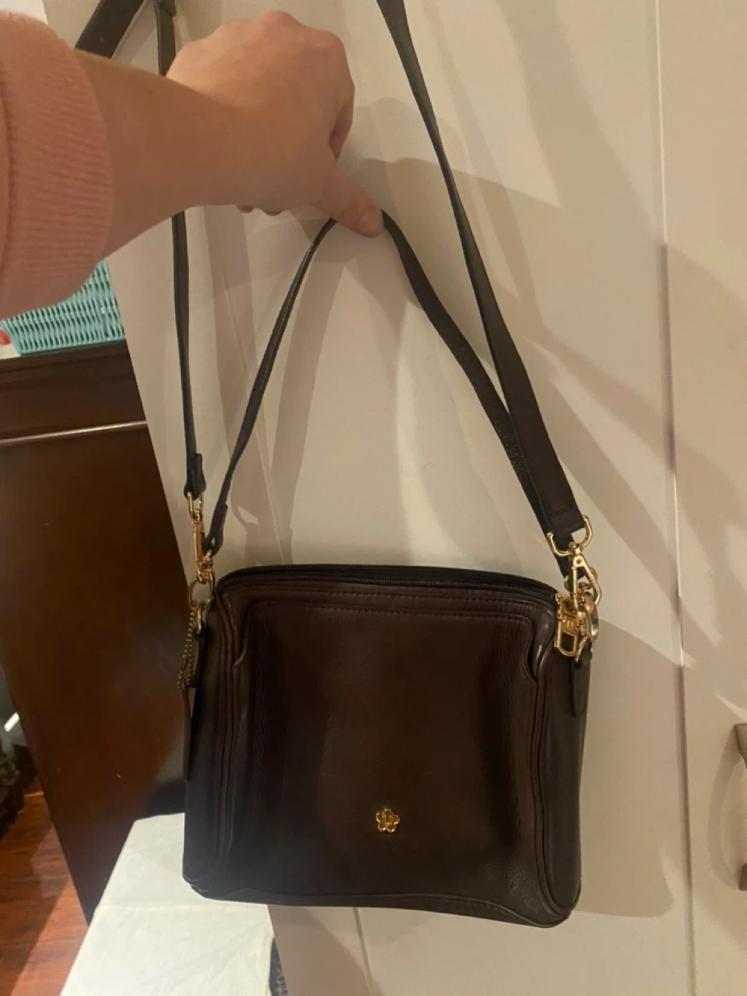 This is a ULA ULA brown leather crossbody bag. It's made of genuine leather and has a flower emblem on the front. Interior features a zippered pocket.