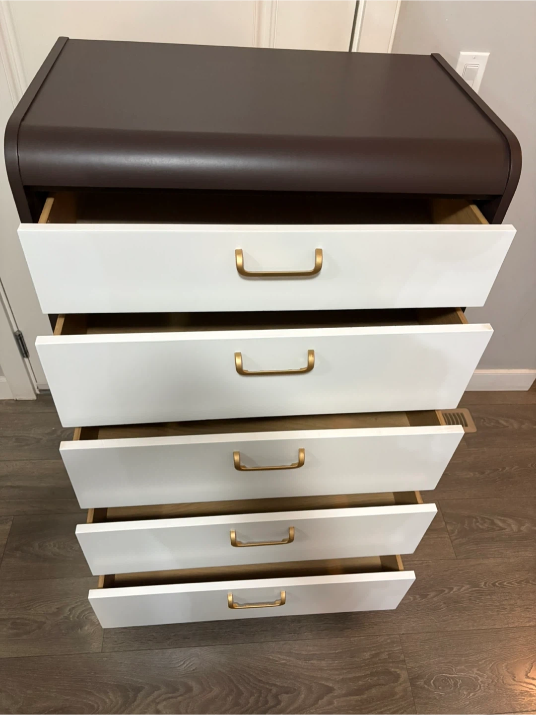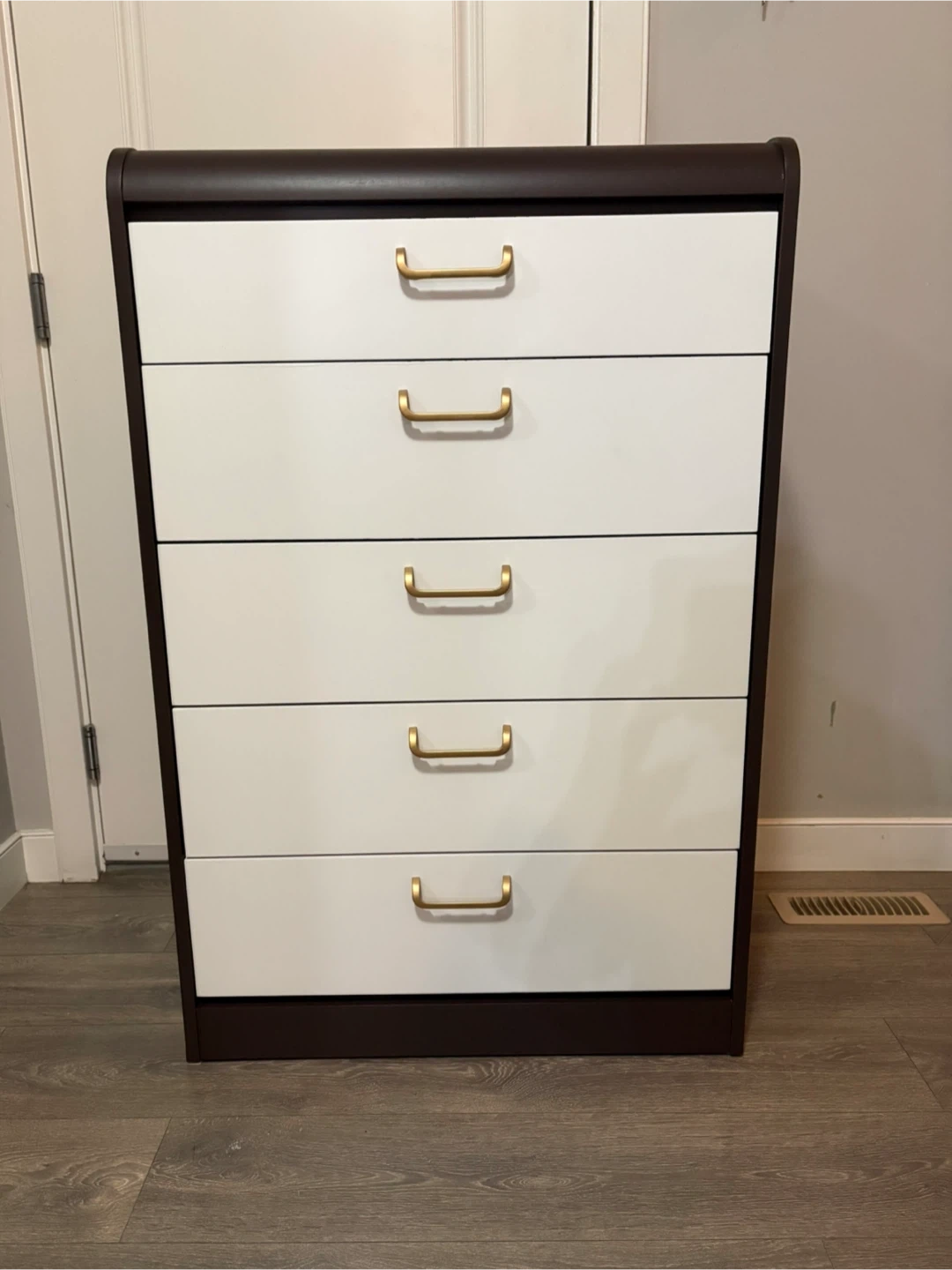 This stylish refinished brown dresser features five white drawers, each equipped with sleek gold handles. It's in excellent condition. It is a functional and eye-catching piece of furniture. The drawers are very clean and slide smooth.