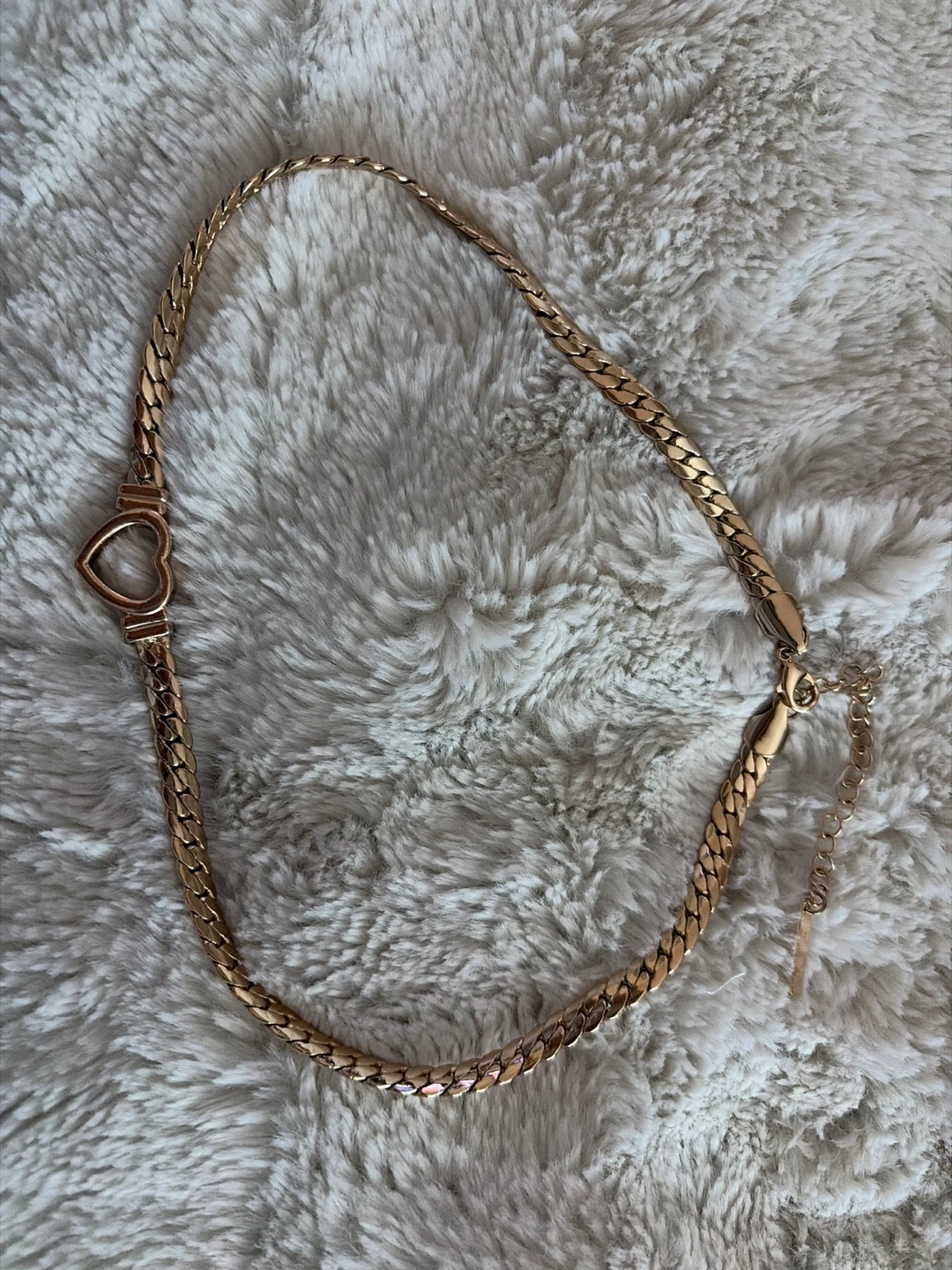 Gold tone chain necklace with a heart-shaped pendant. It features a link chain design. Has an adjustable clasp closure.