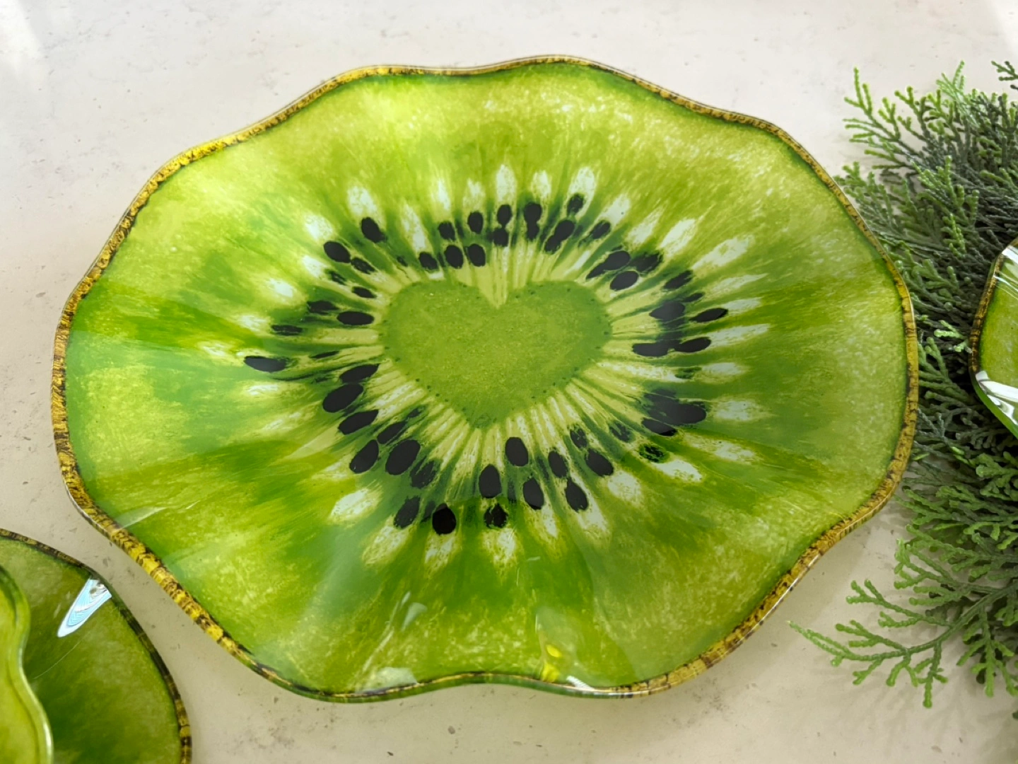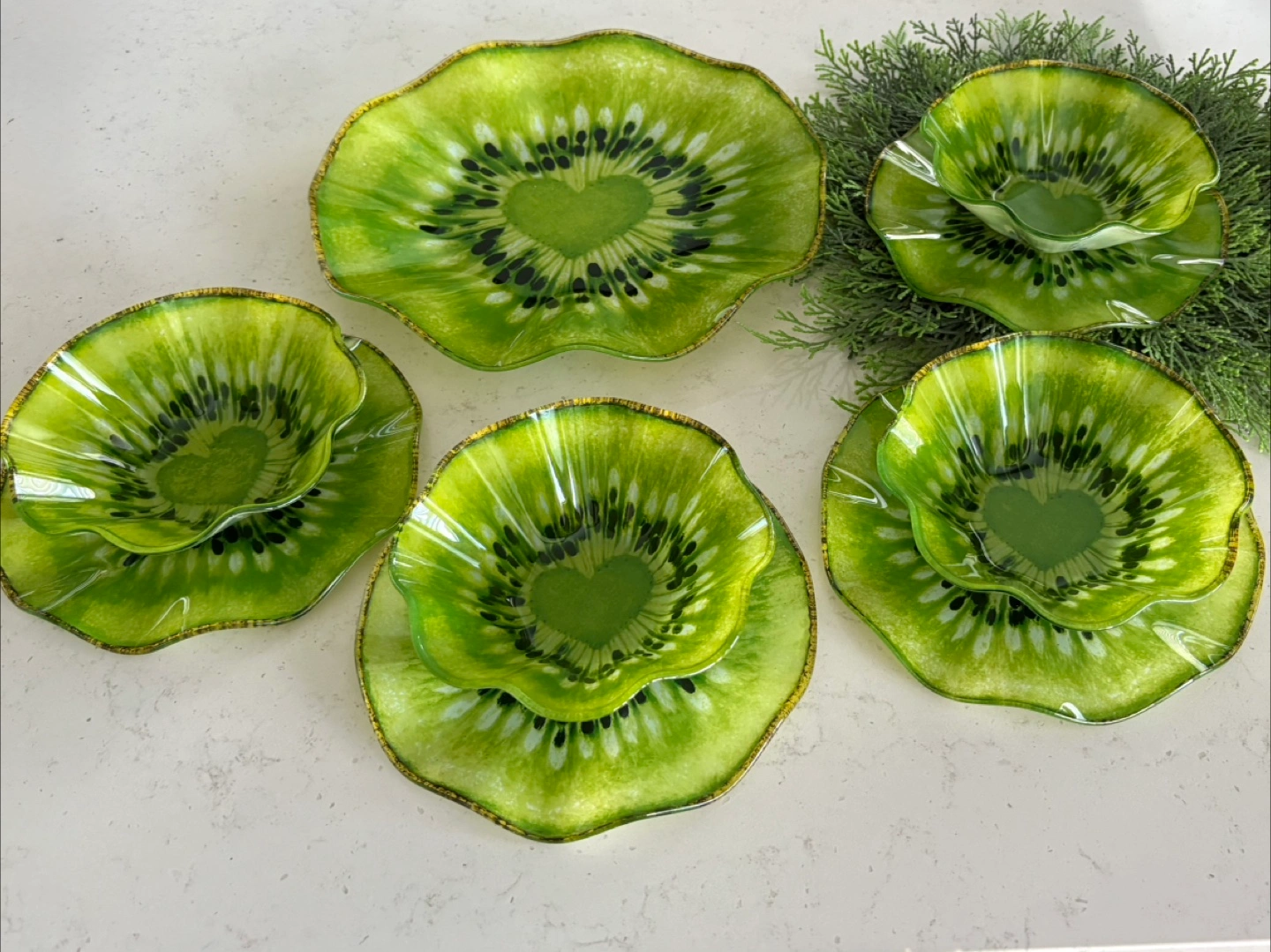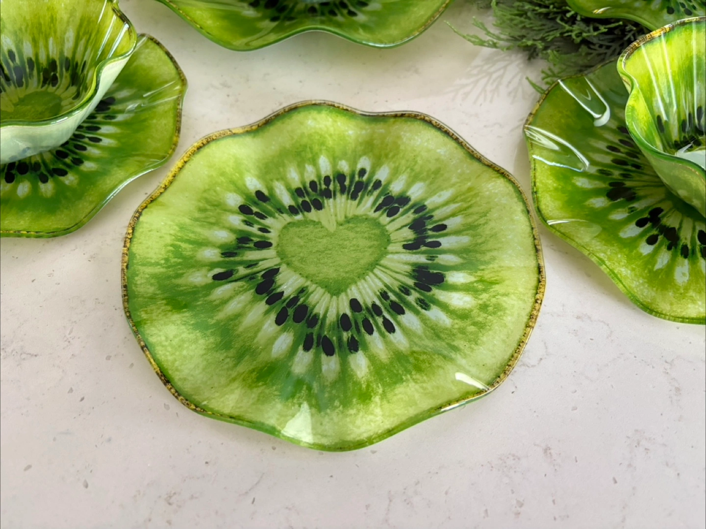 Set of five decorative kiwi π₯ glass plates and bowls.