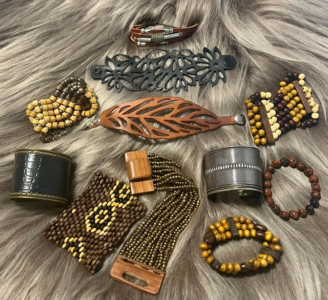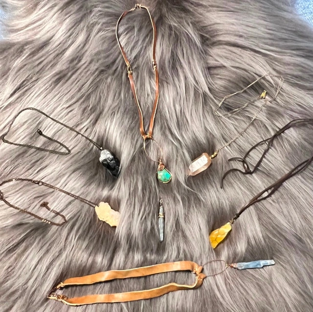 I have an assortment of unique handmade jewelry for sale in bundles. First are the bracelets, $45 for them all. Second are the necklaces, featuring different styles of stone pendant necklaces, $60 for them all. Last are earrings; I have 4 bundles available, priced at $25 each.