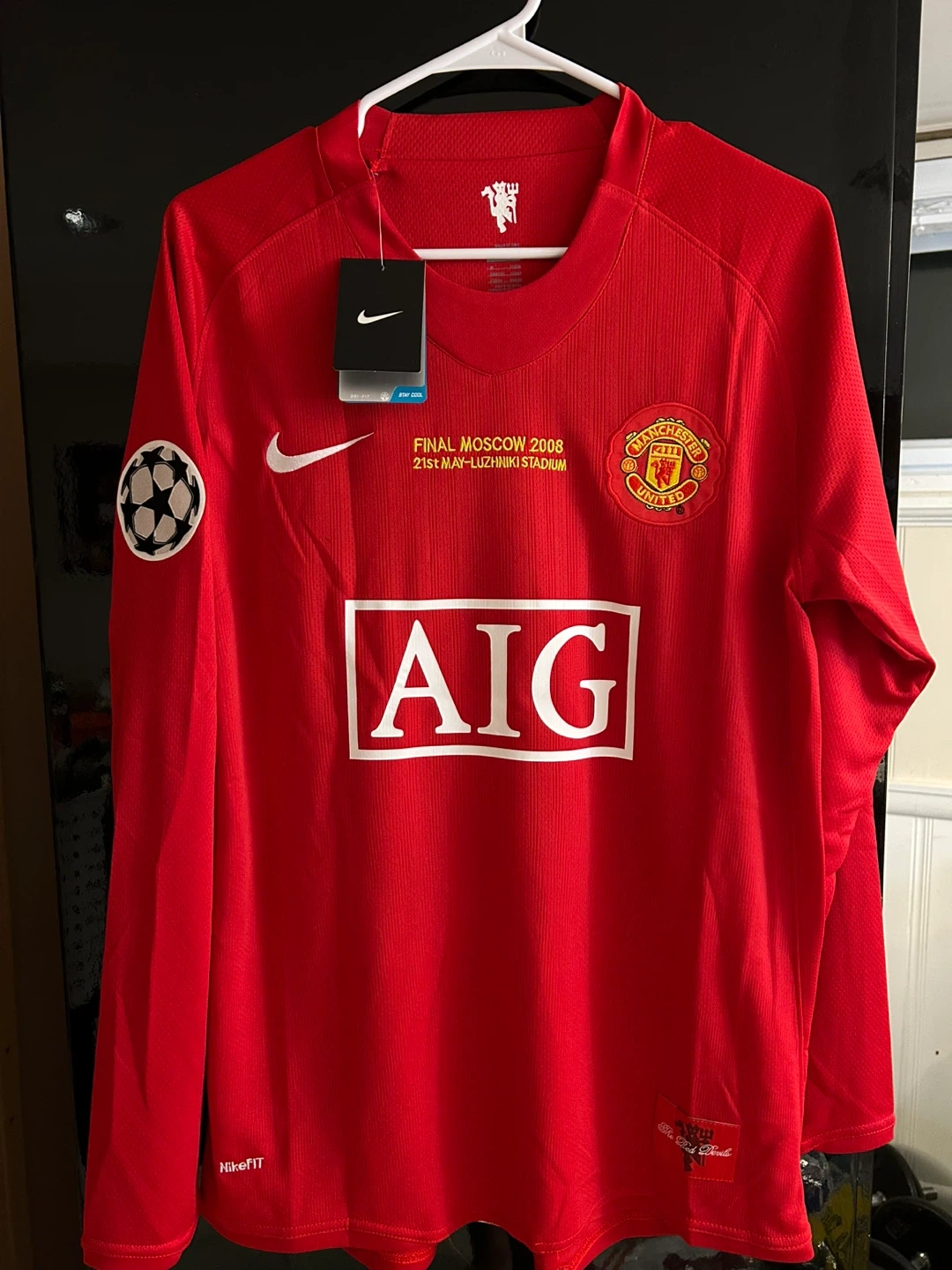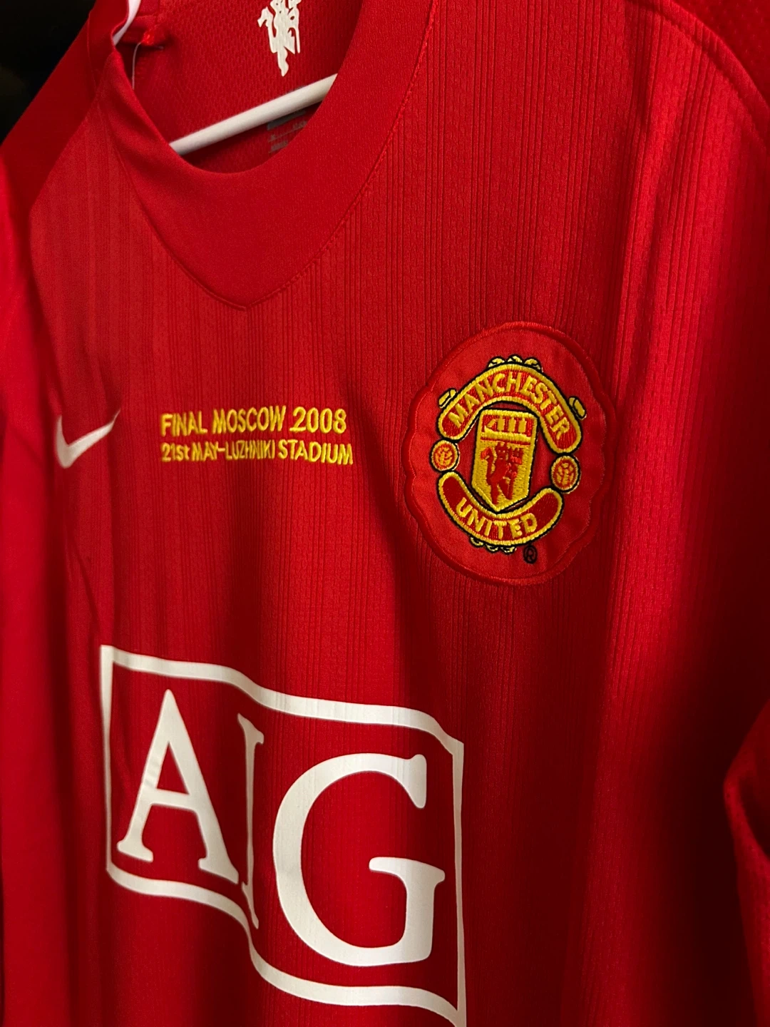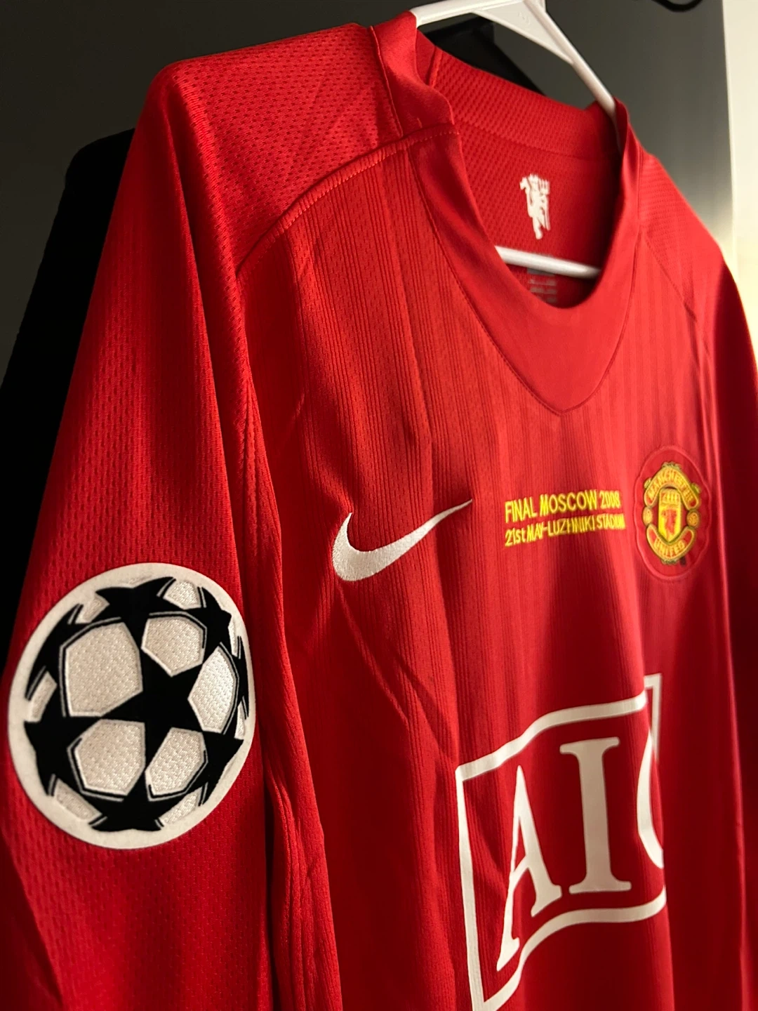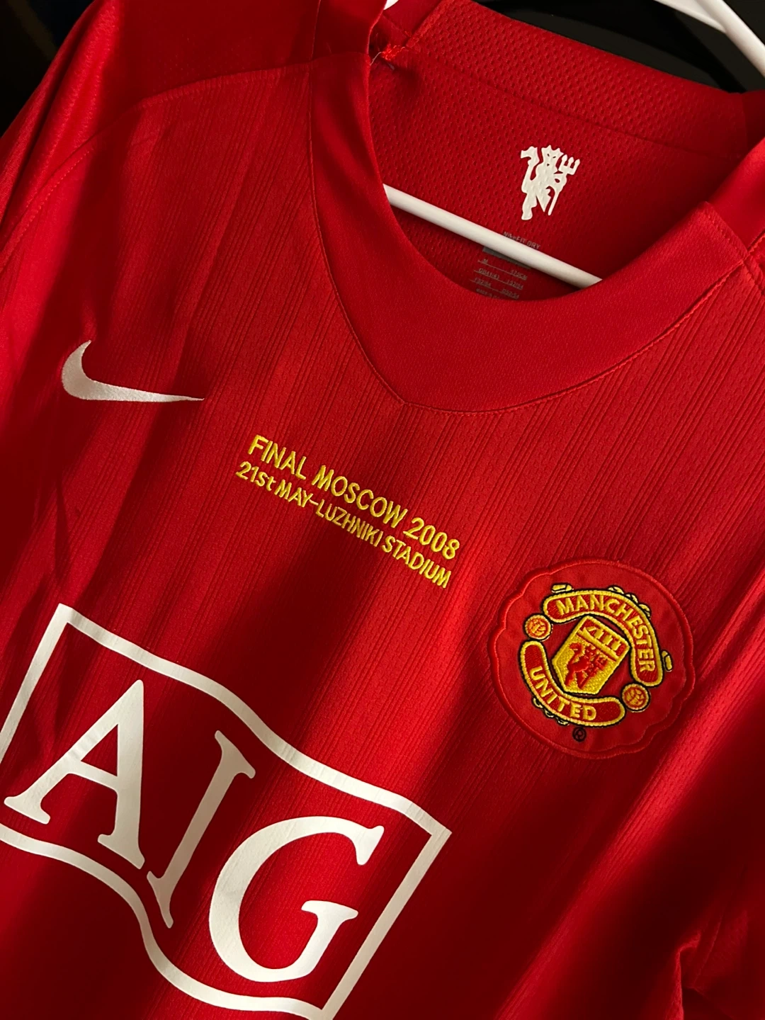 This is a Manchester United football jersey from the 2008 Moscow Final. It features the "AIG" sponsor and "RONALDO 7" on the back. The shirt is red with white accents and has the Nike swoosh. It's a collector's item for football fans!