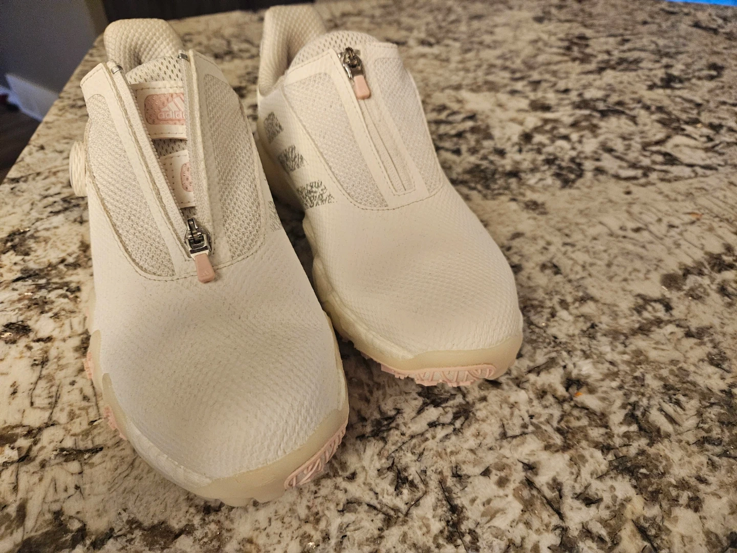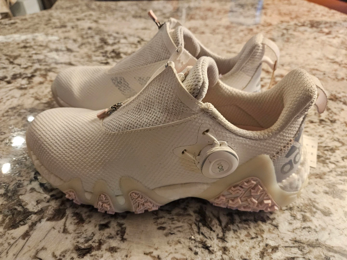 New - White Adidas women's golf shoes with pink accents and BOA lacing system. Features a textile upper and rubber sole for good grip. Size 8 U.S.