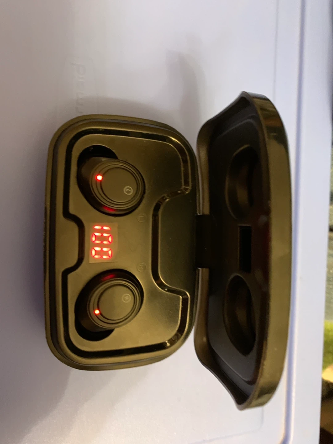 AIKELA wireless earbuds come with a charging case. The case displays the battery level. Red indicator lights show on the earbuds.
