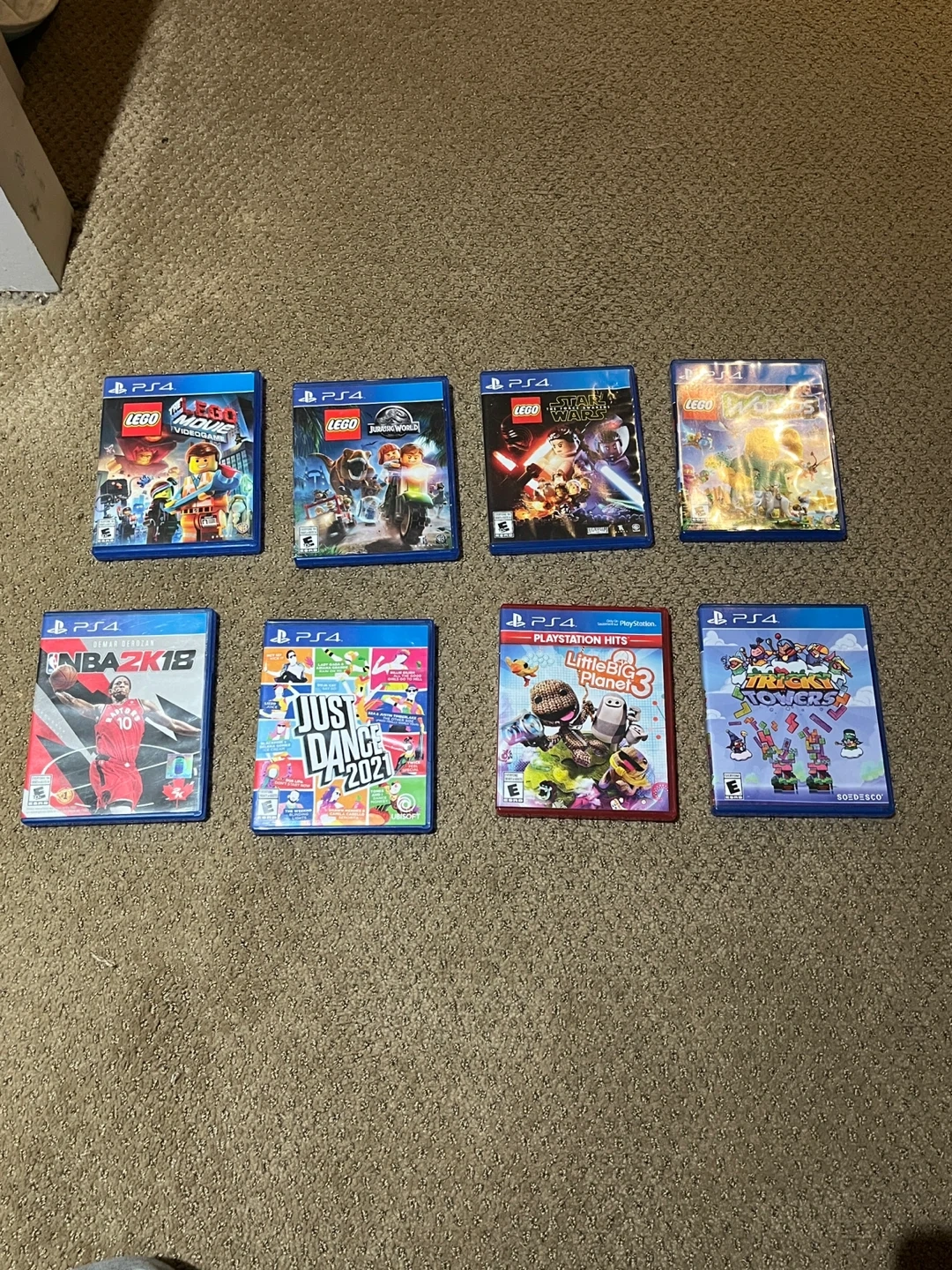PlayStation 4 (1tb) with 2 controllers and a bundle of eight PlayStation 4 video games. Includes LEGO Jurassic World, LEGO Marvel Super Heroes, LEGO Star Wars: The Skywalker Saga, LEGO City Undercover, NBA 2K18, Just Dance 2021, LittleBigPlanet 3, and Sackboy A Big Adventure. These games are perfect for family fun nights or for any gamer looking to expand their PS4 library.