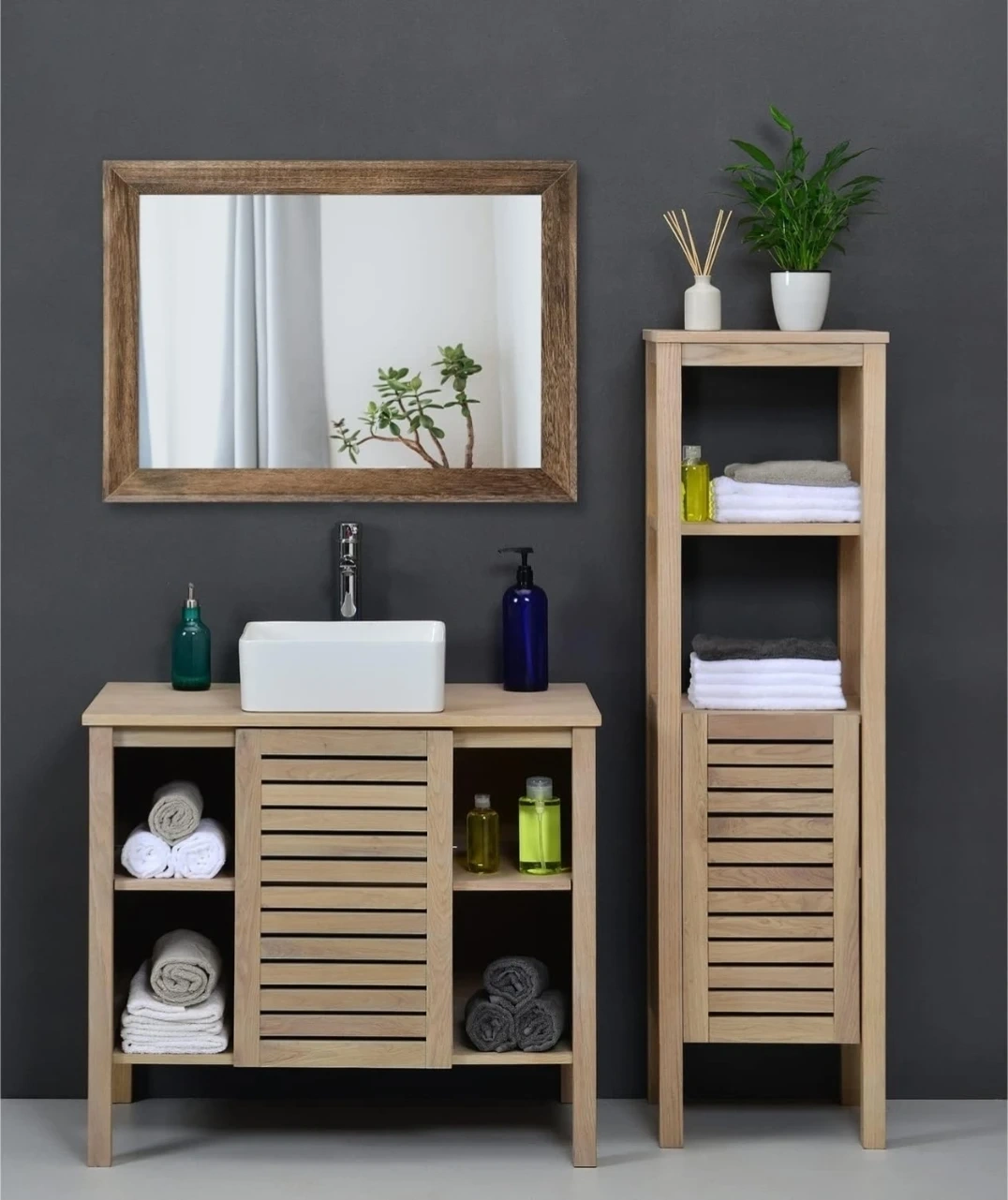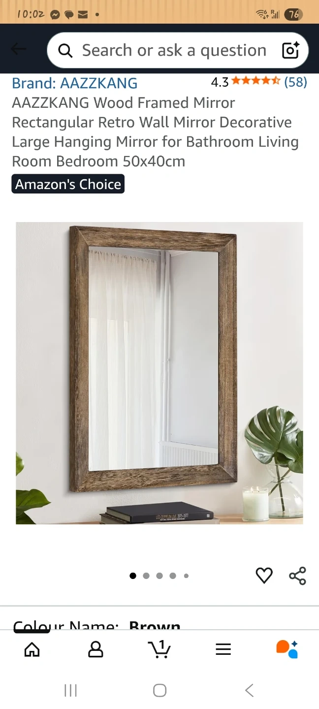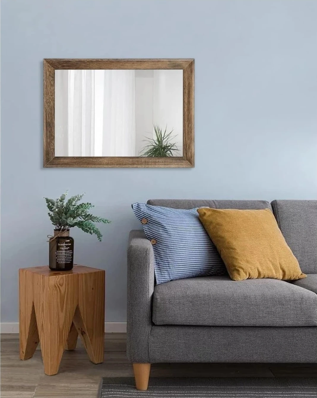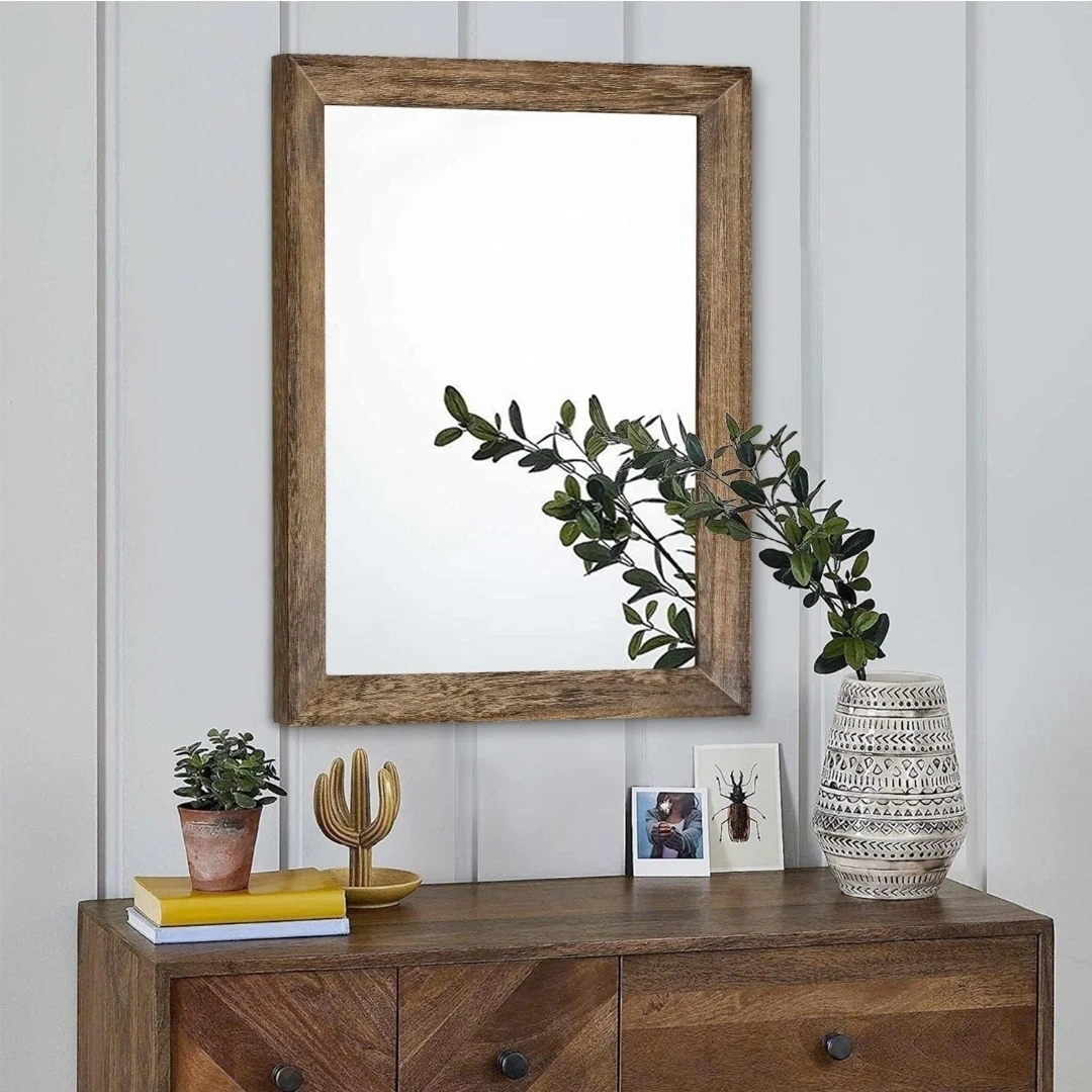 This AAZZKANG mirror features a rustic wood frame in a brown finish. It measures 50cm by 40cm, offering a large size for your space. It can be mounted vertically or horizontally and includes four saw tooth hangers.