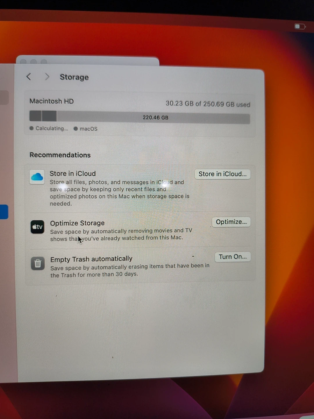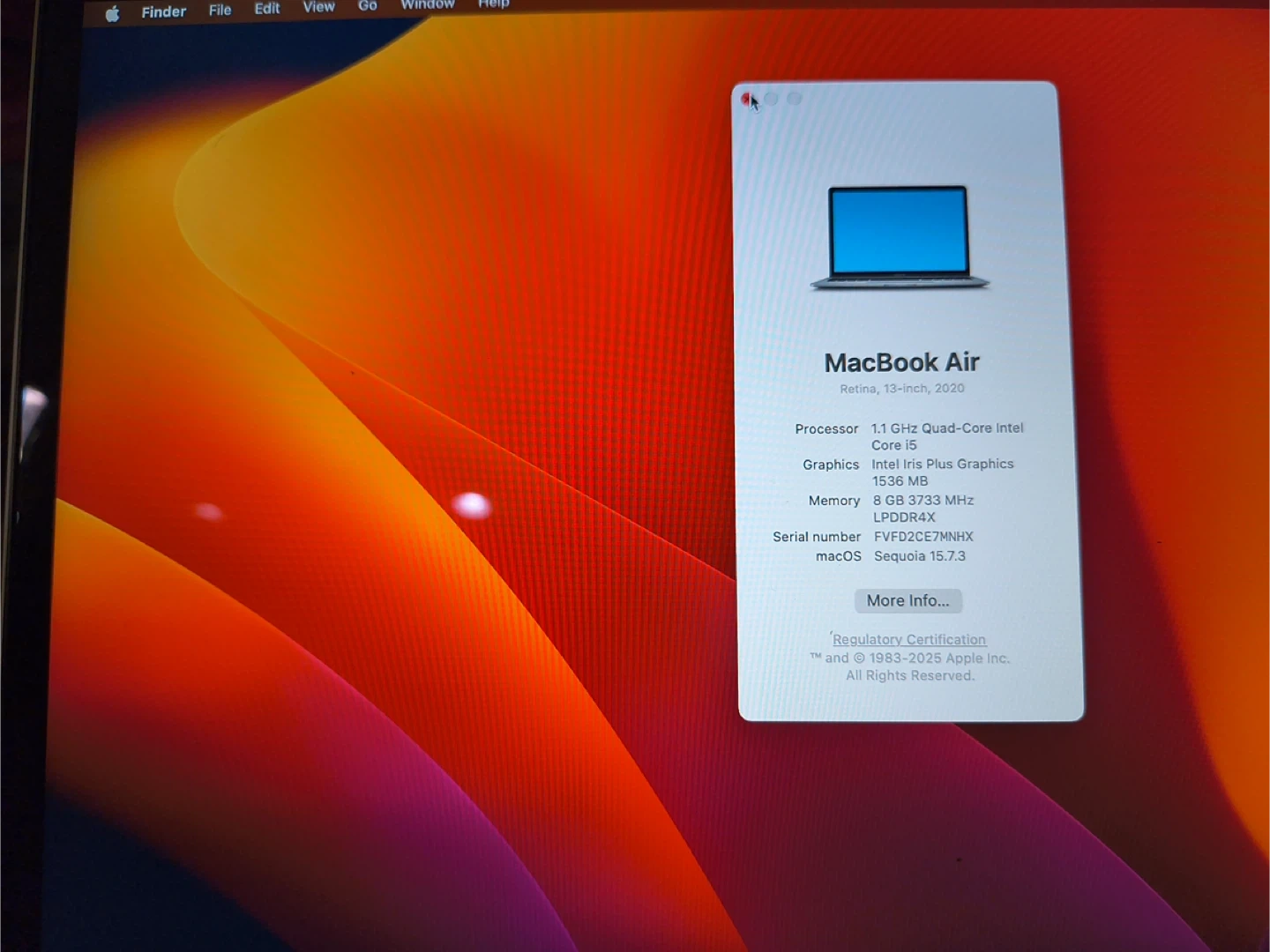 MacBook Air Retina 13-inch, 2020 model. It's powered by a 1.1 GHz Quad-Core Intel Core i5 processor with 8 GB RAM. Storage is 250.69 GB, with 220.46 GB available. Running macOS Sequoia 15.7.3. Batteries 100% as protective case.
