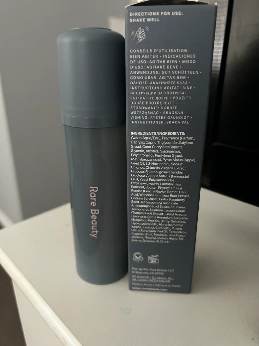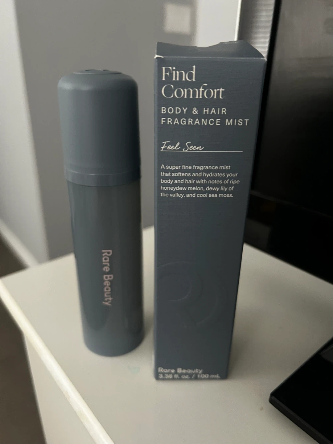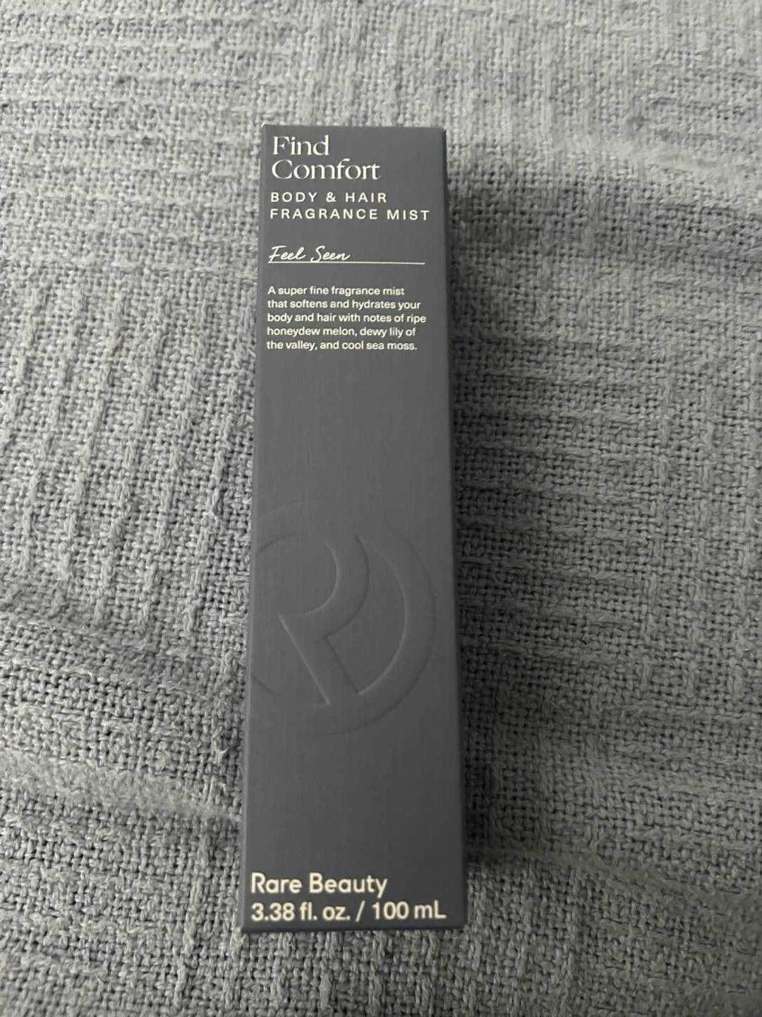 Rare Beauty Find Comfort Body & Hair Fragrance Mist in the 'Feel Seen' scent. This super fine fragrance mist softens and hydrates your body and hair. It comes in a 100mL bottle. Shake well before use!