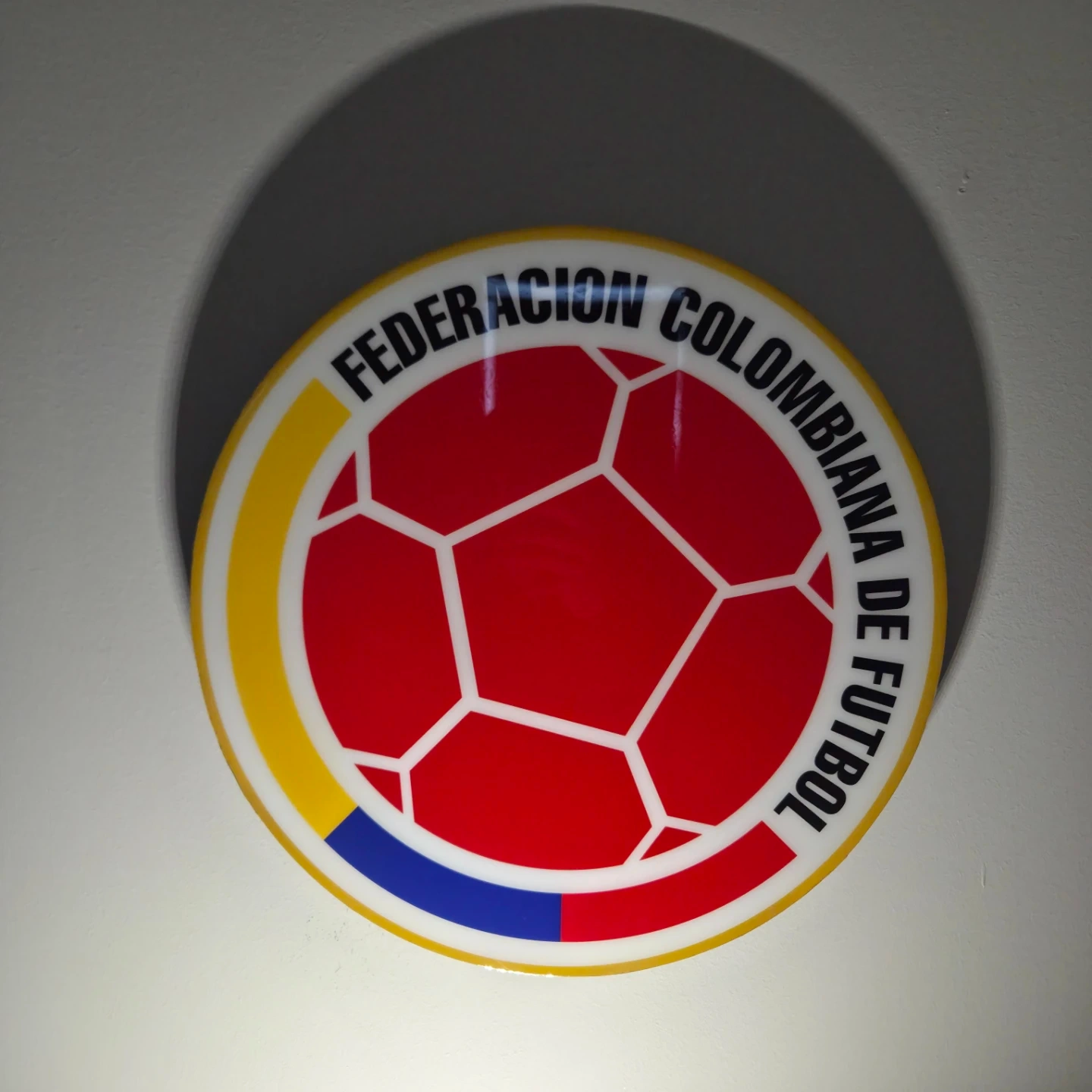 This is a wall sign for the Federacion Colombiana de Futbol. It features the organization's logo with a soccer ball design. Great for any fan of Colombian football!