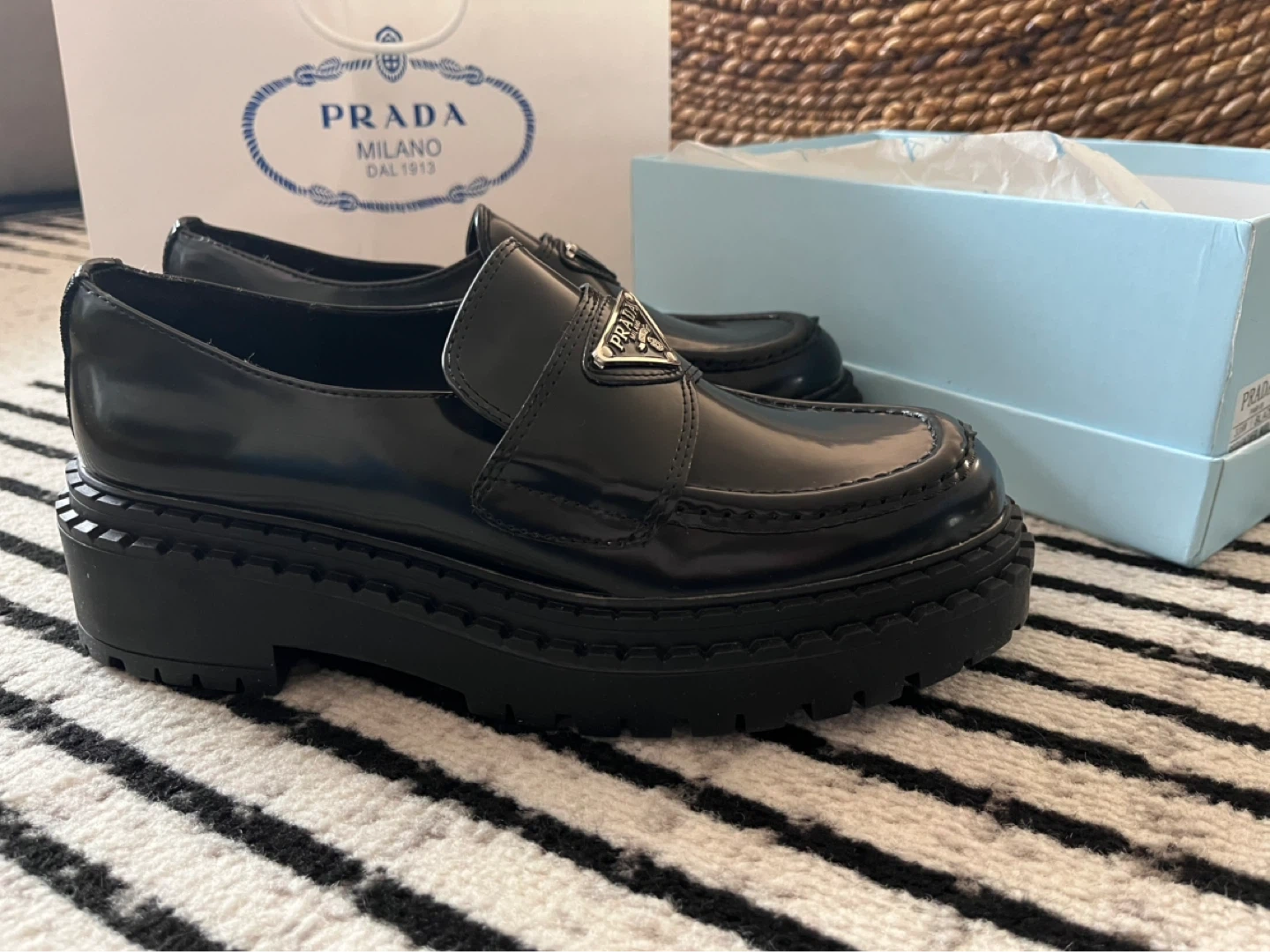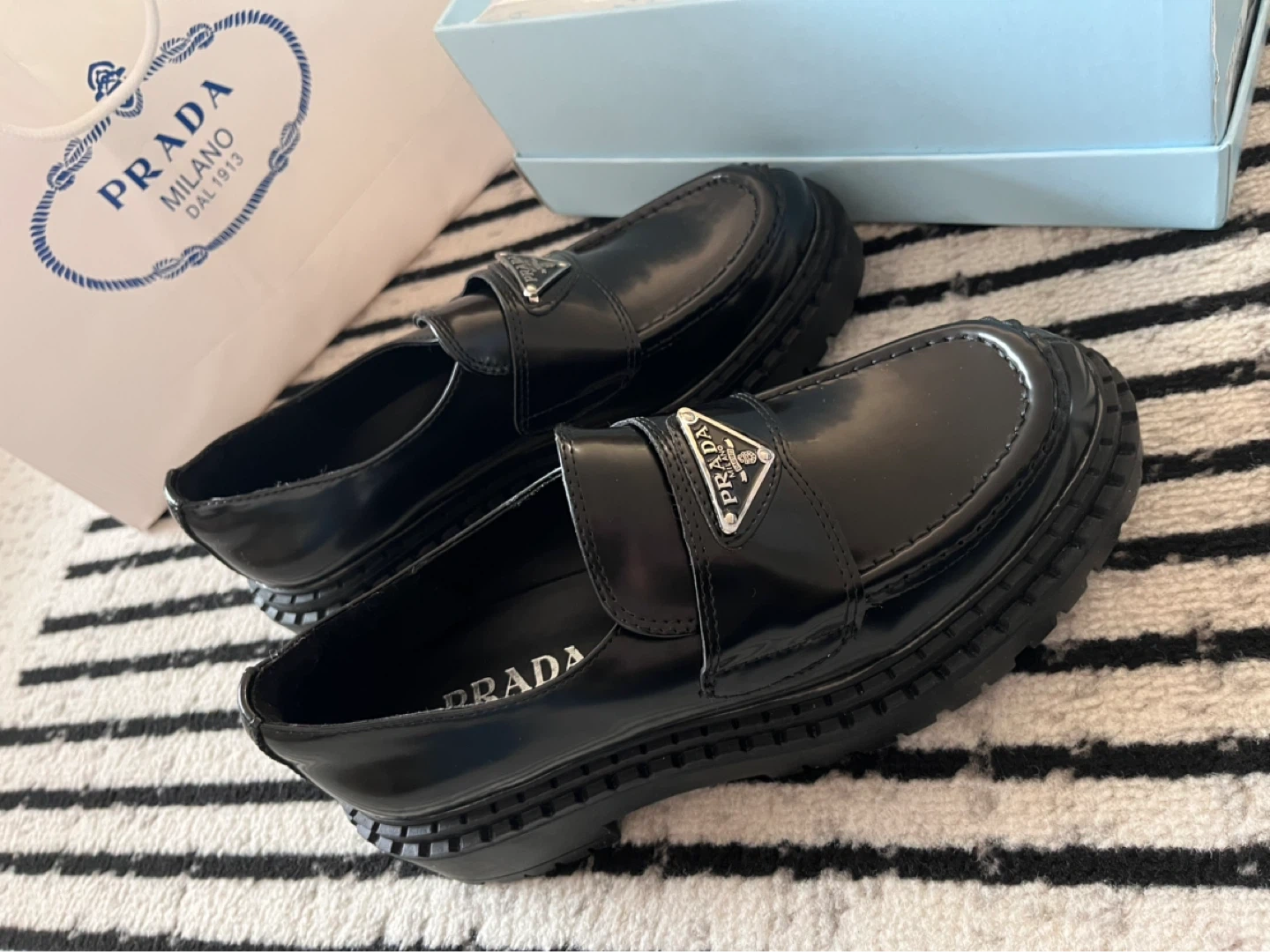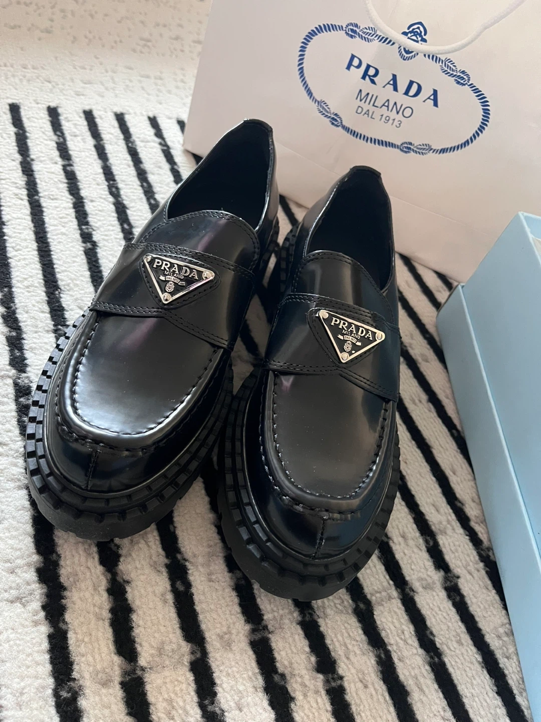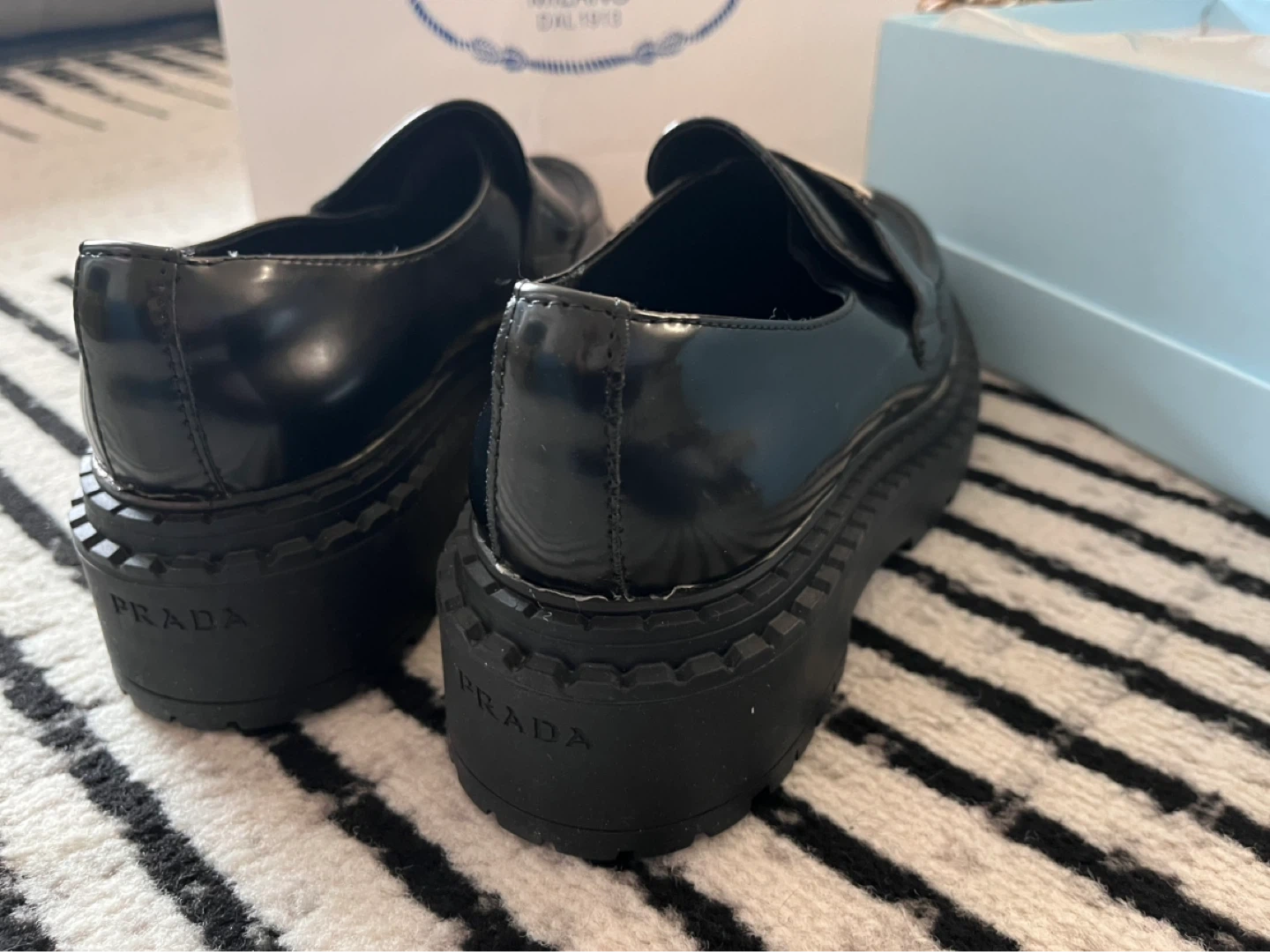 These are Prada black patent leather platform loafers. They feature a sleek, shiny finish and a substantial lug sole.