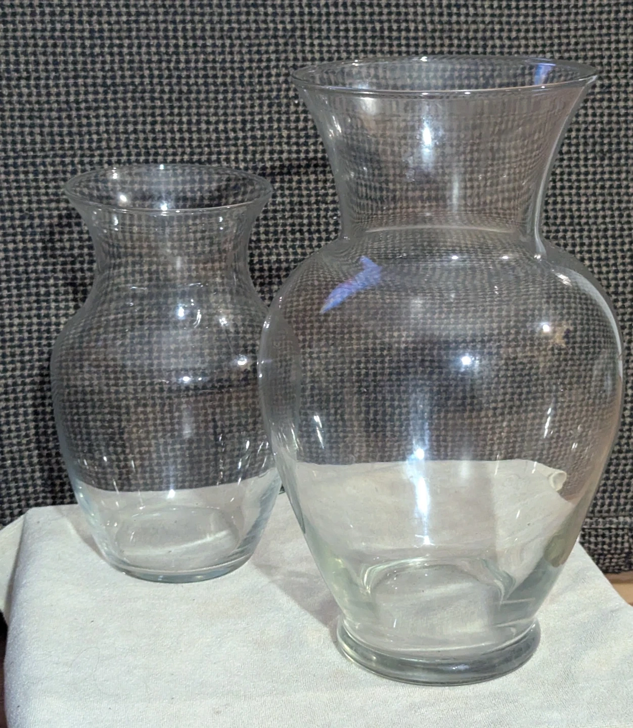 This is a set of two clear glass vases, one taller and one shorter. They're made of clear glass. These vases are great for displaying flowers or as decorative pieces on their own. Perfect for your home or as a gift!
