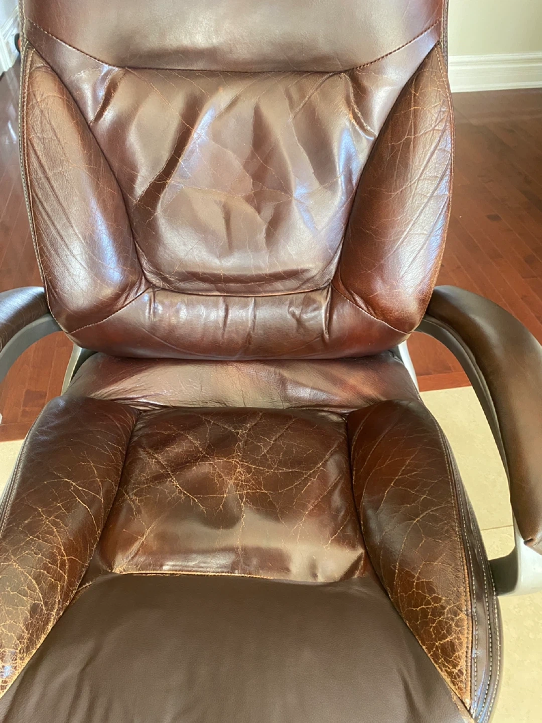 A comfortable brown faux leather office chair with a tilt and swivel function. It's designed for long hours of work. This chair would be useful for anyone needing an office setup at home.