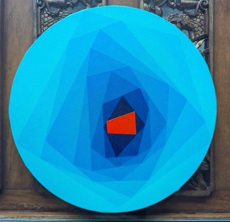 Three round paintings on canvas. Each painting is unique and features abstract geometric shapes and colours. These paintings would look great in a modern home.