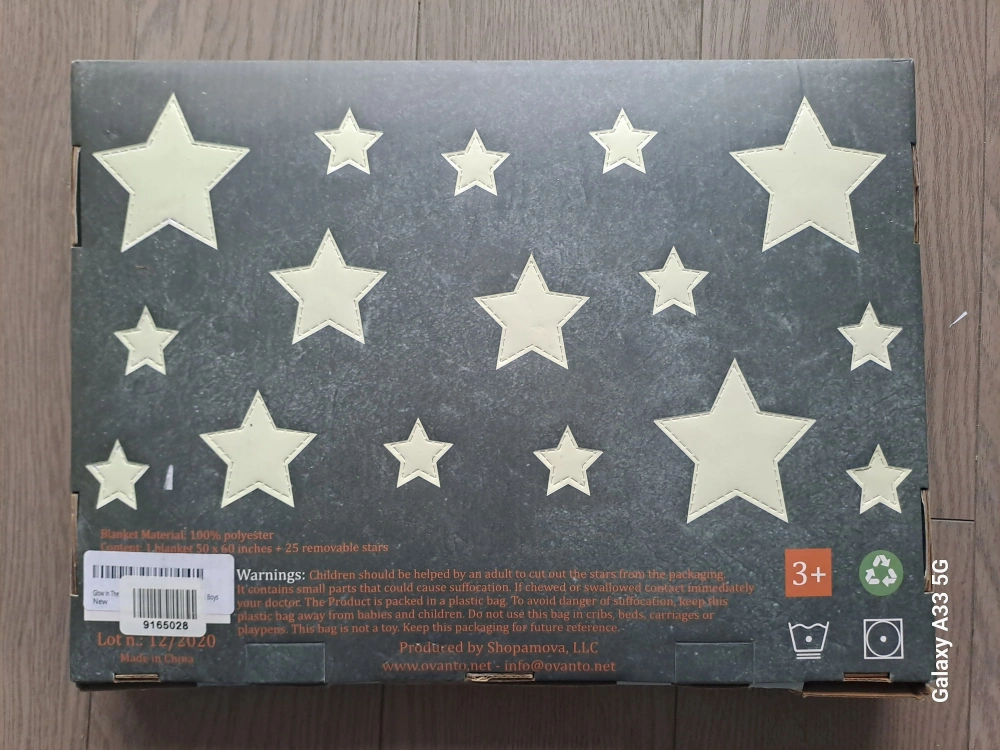 Children's glow in the dark blanket. Includes 25 removable glowing stars. 100% polyester. Machine washable. Suitable for children aged 3+