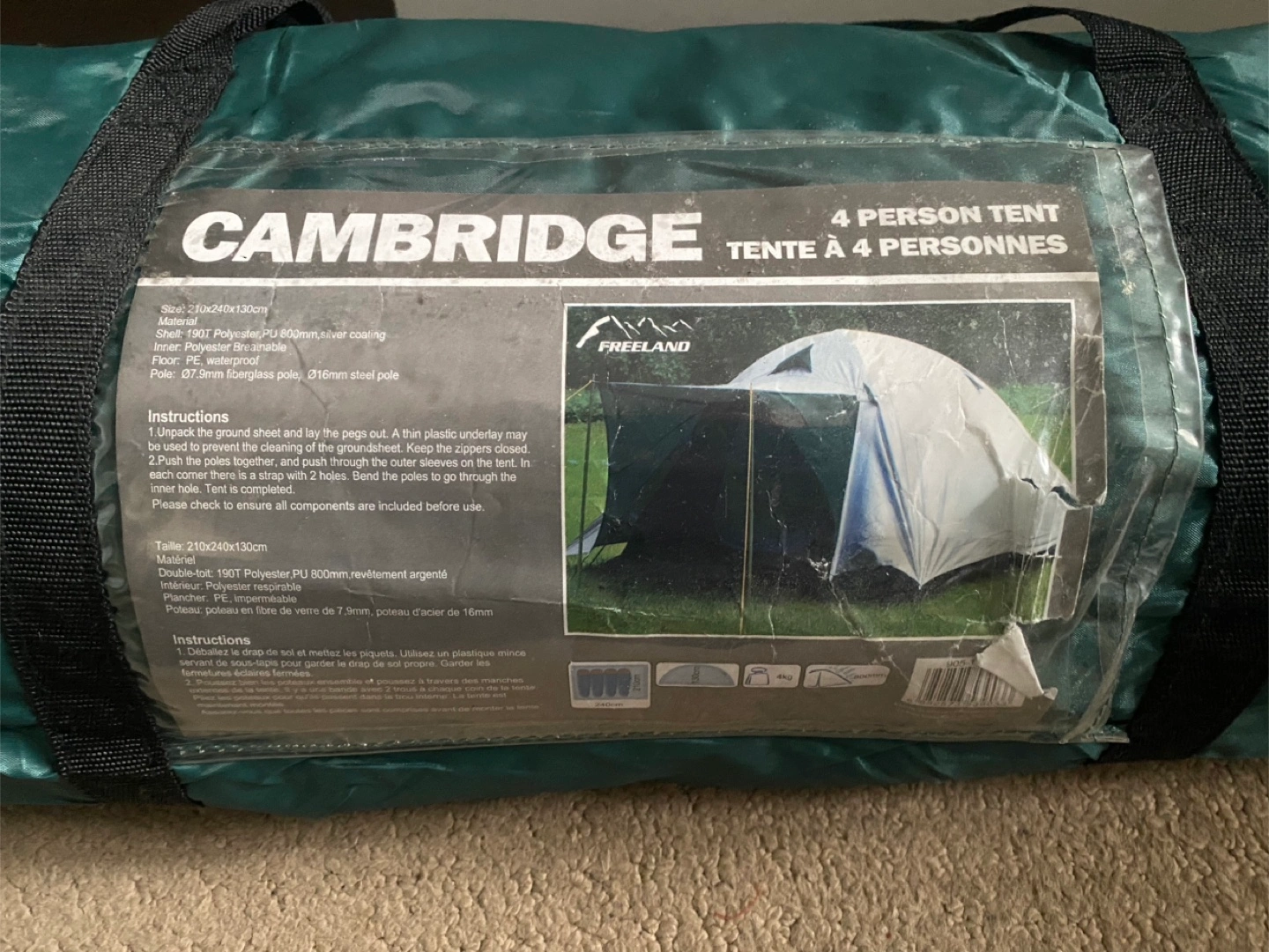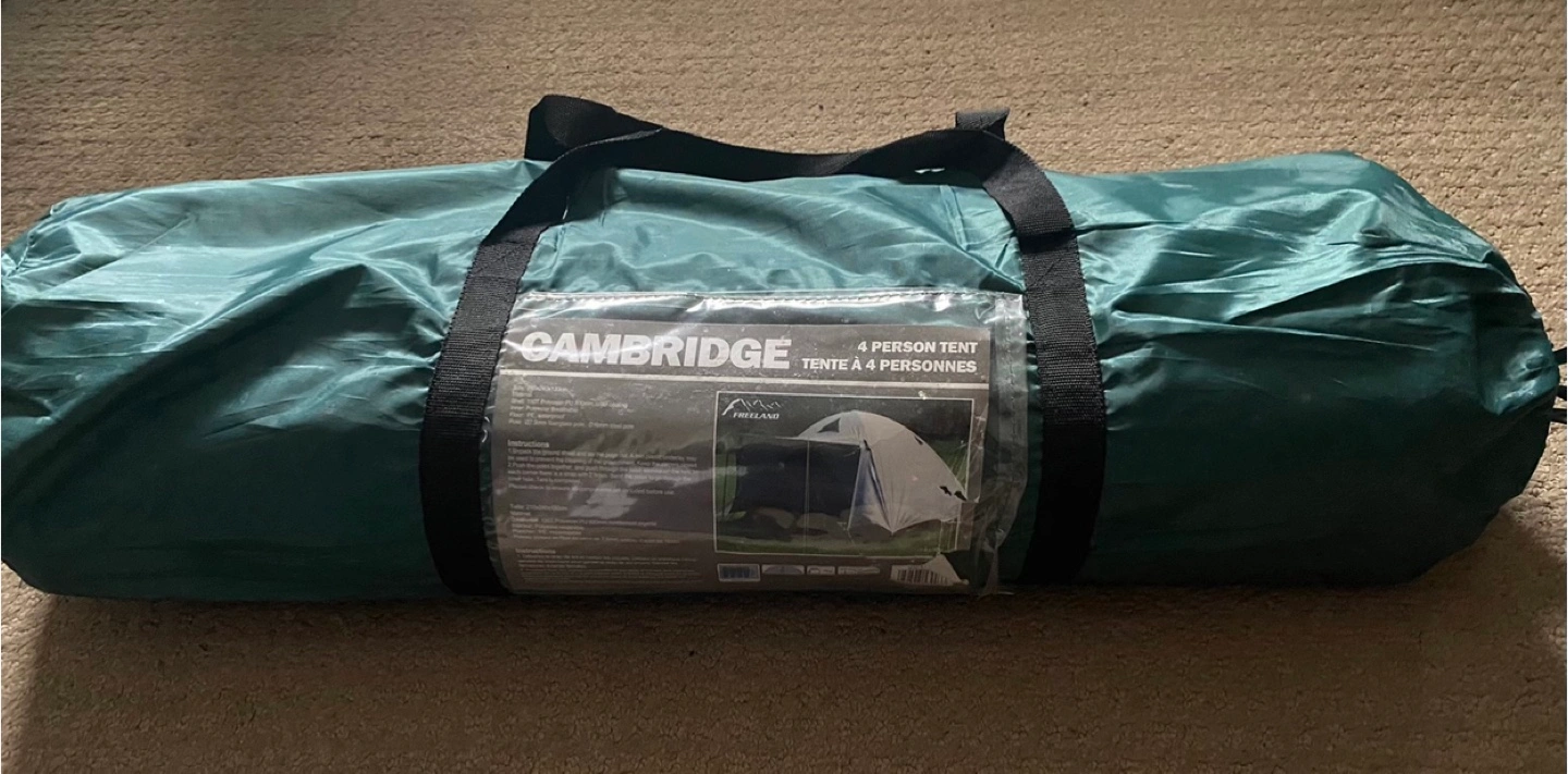 Green tent in a carrying bag. Black straps for carrying. Has a window with a view of the tent's design. This tent is perfect for camping and enjoying the outdoors.