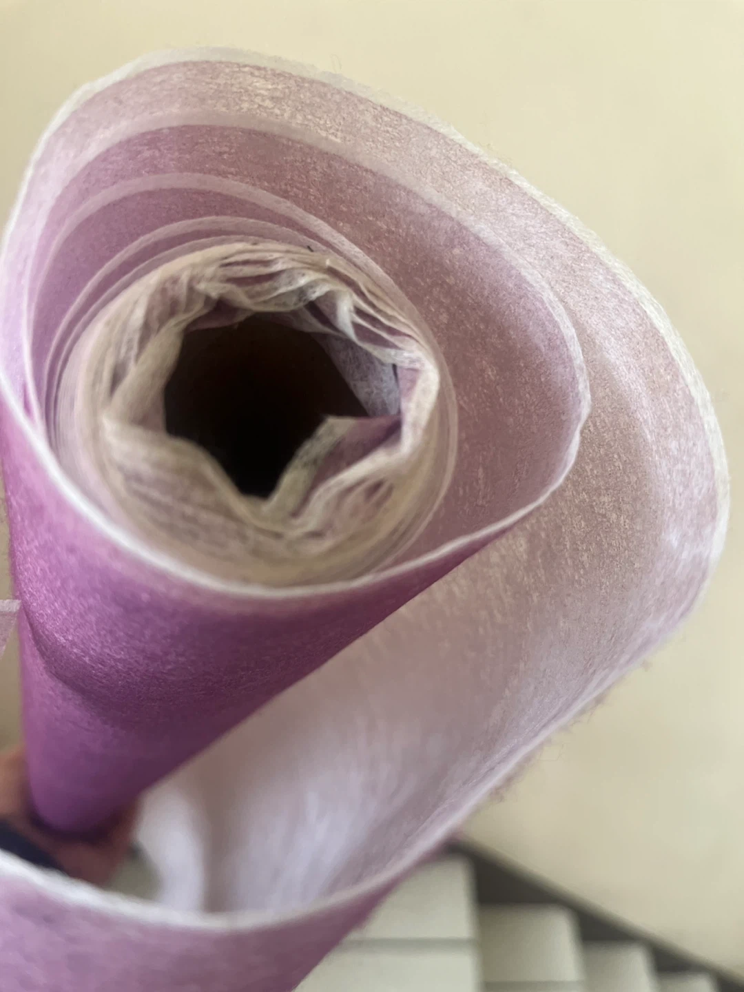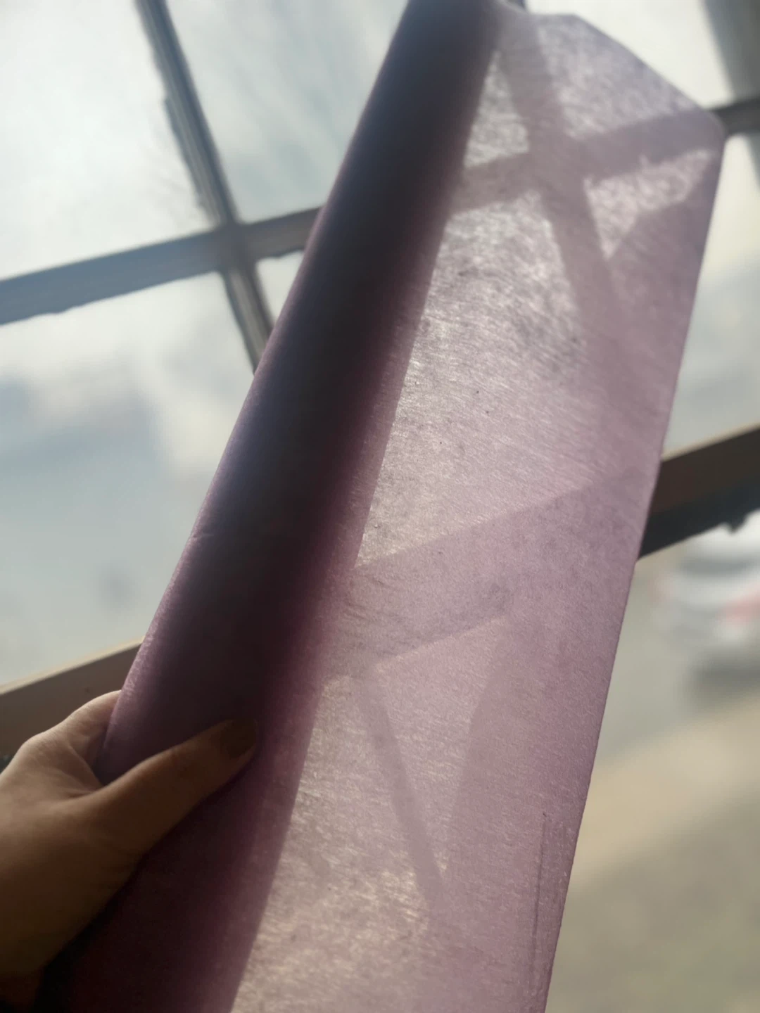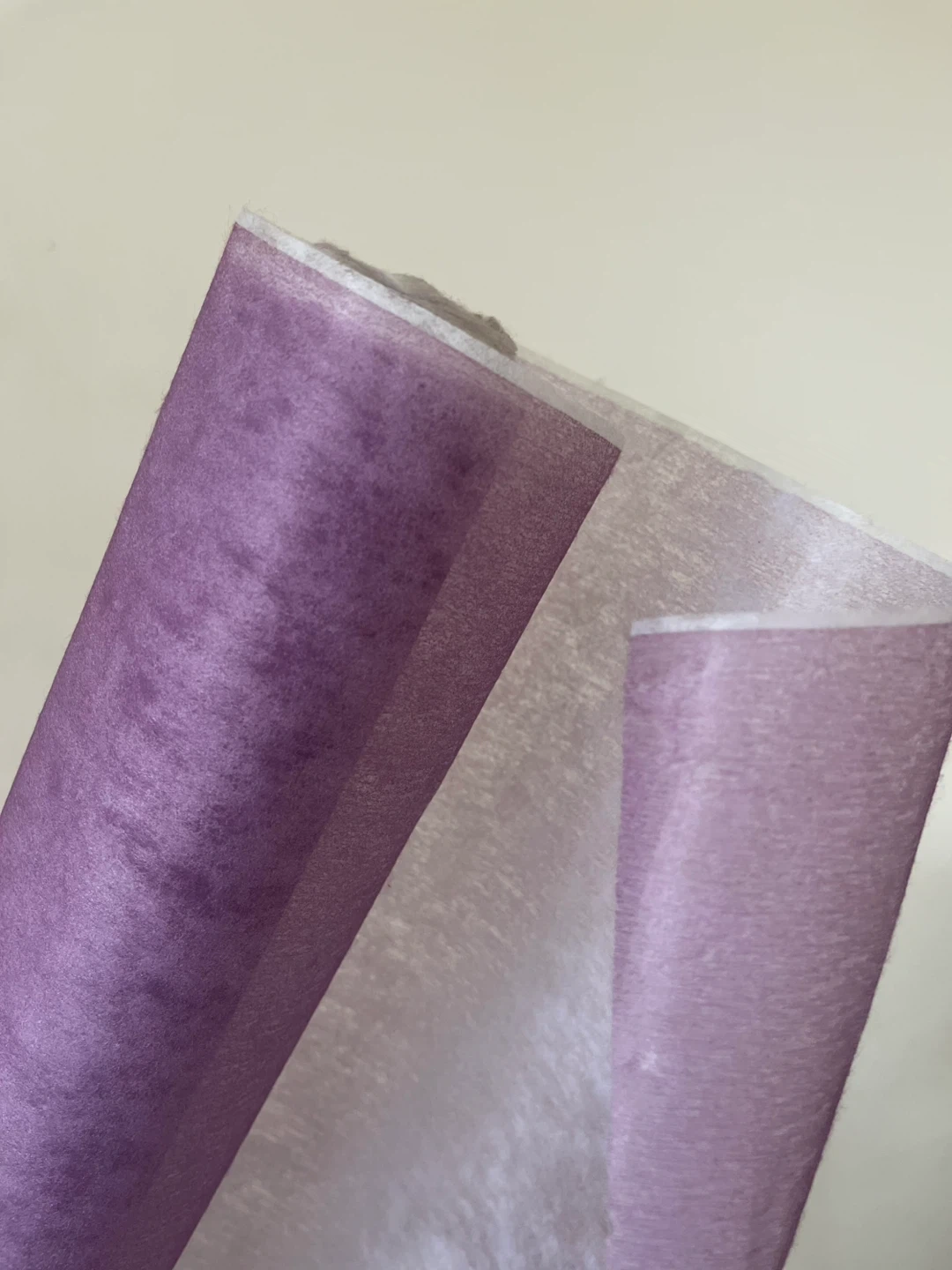 A roll of lilac organza fabric. It's thin and has a delicate texture. Perfect for crafting or decorative wrapping projects! Leftover from a window shade project also have a roll of soft blue leftover