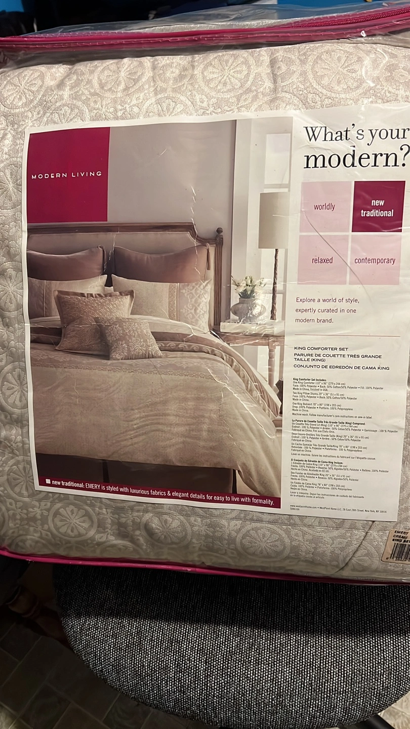 This is a King comforter set from West Point Home's Modern Living collection. It includes a comforter, pillow shams, and a bedskirt. The set is designed in a worldly and new traditional style with luxurious fabrics and elegant details.