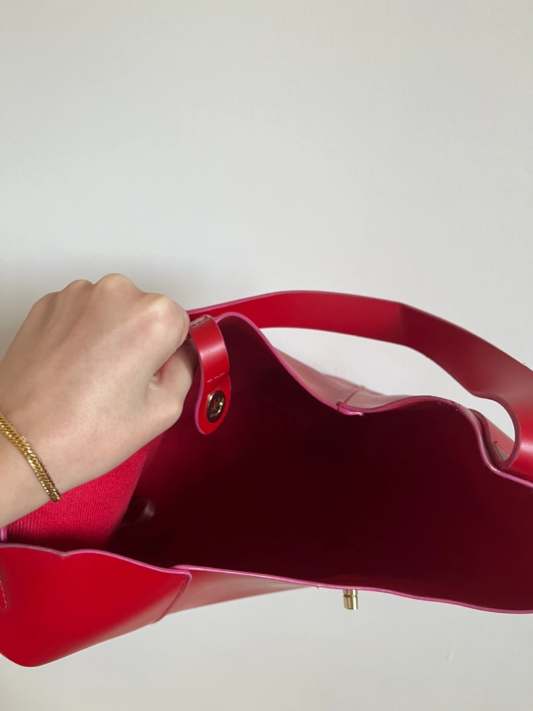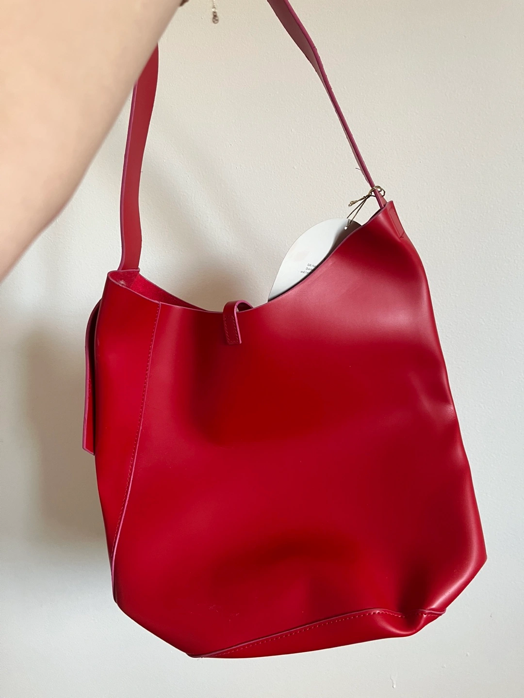 Eye-catching red shoulder bag. Features a simple strap, and gold-toned hardware. Its roomy interior can hold all of your essentials for a relaxing day out. Excellent for everyday use.