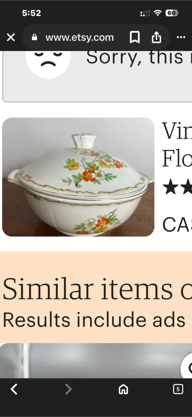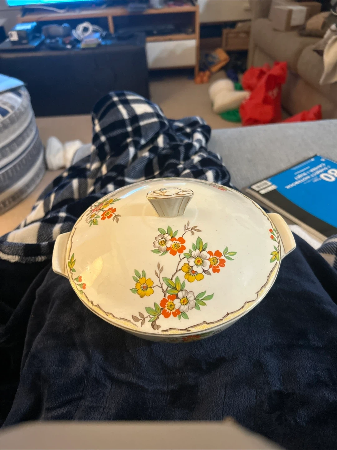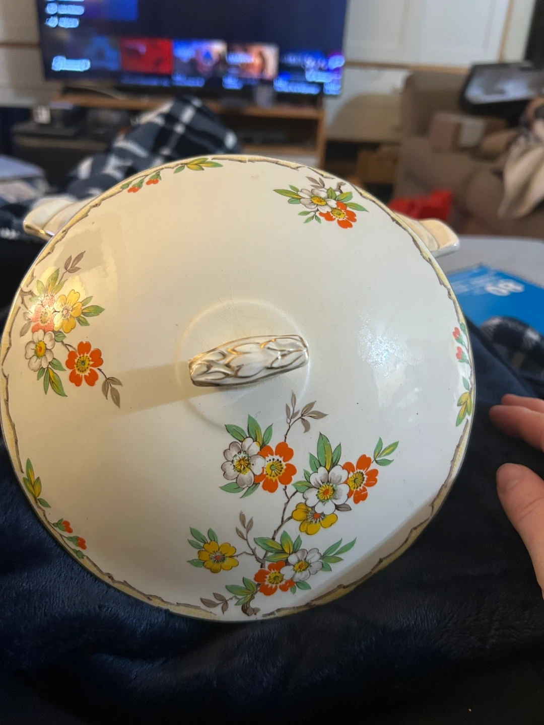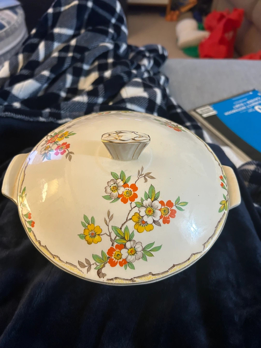 A lovely vintage casserole dish with a decorative floral pattern. It has handles on the sides and a matching lid. The inside shows some signs of use, but it's still a charming piece for serving.