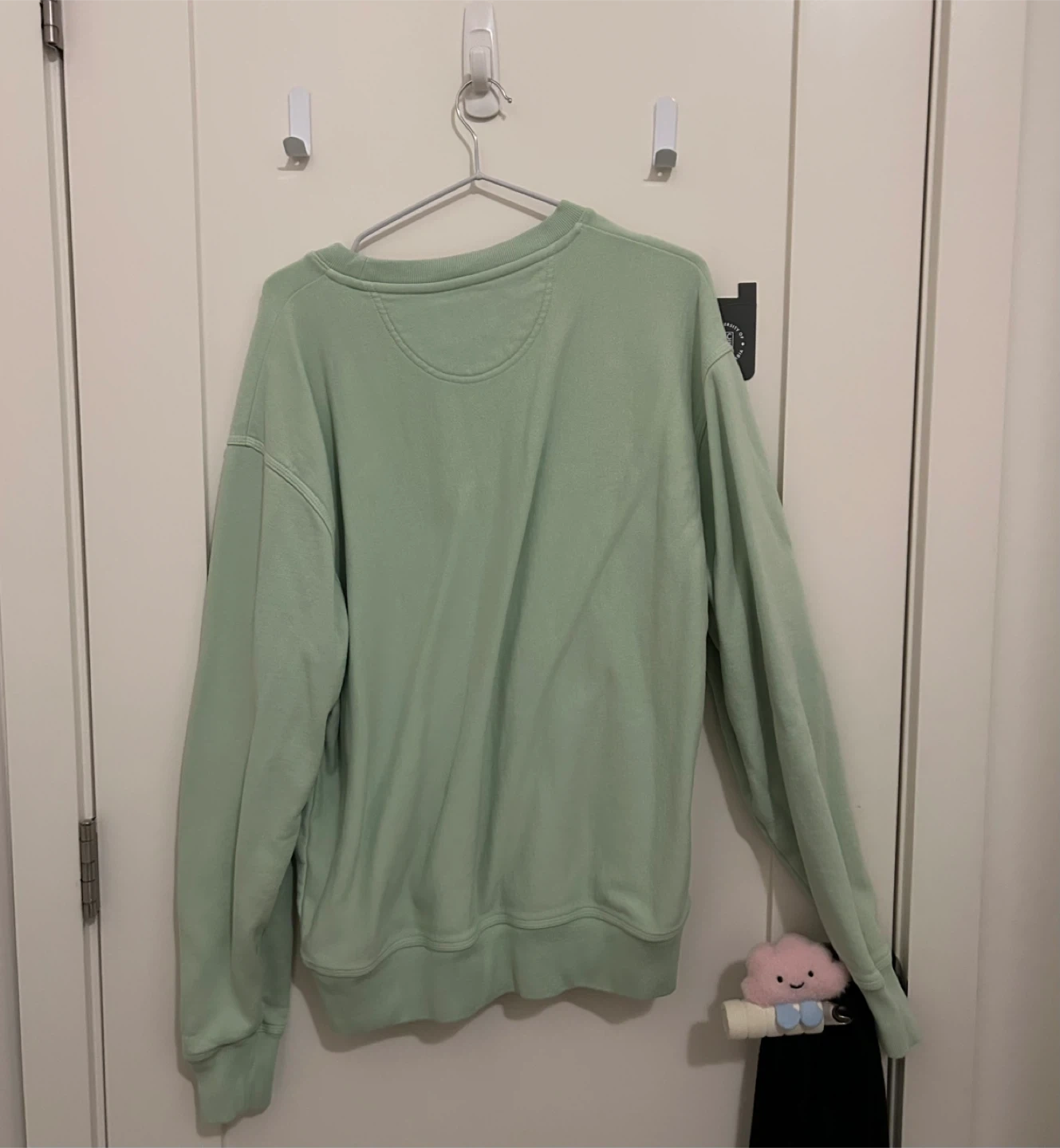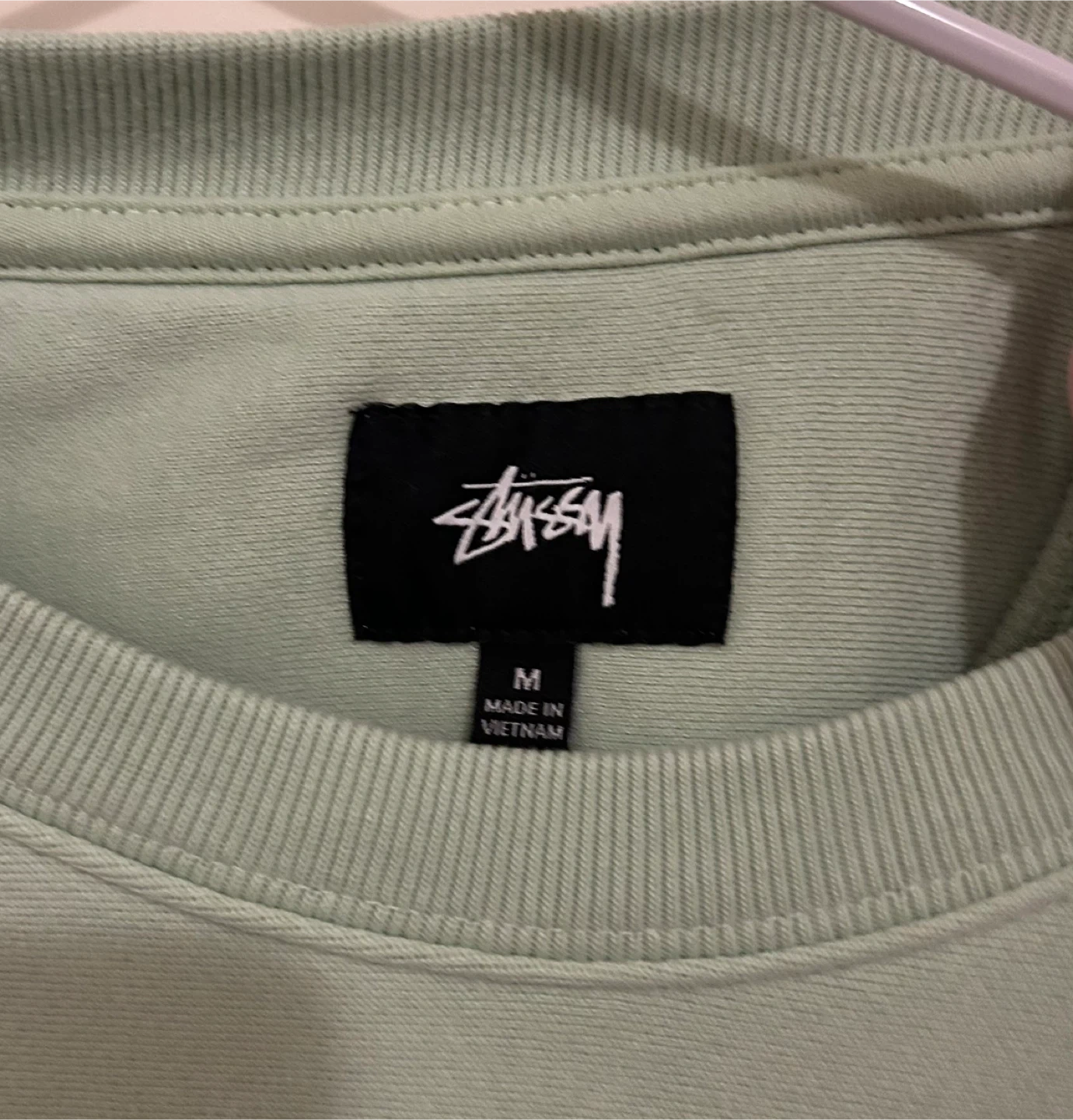 This is a Stüssy crewneck sweatshirt in a light green colour. It's a size medium and made in Vietnam. It's a comfy sweater for casual wear. (Oversized)