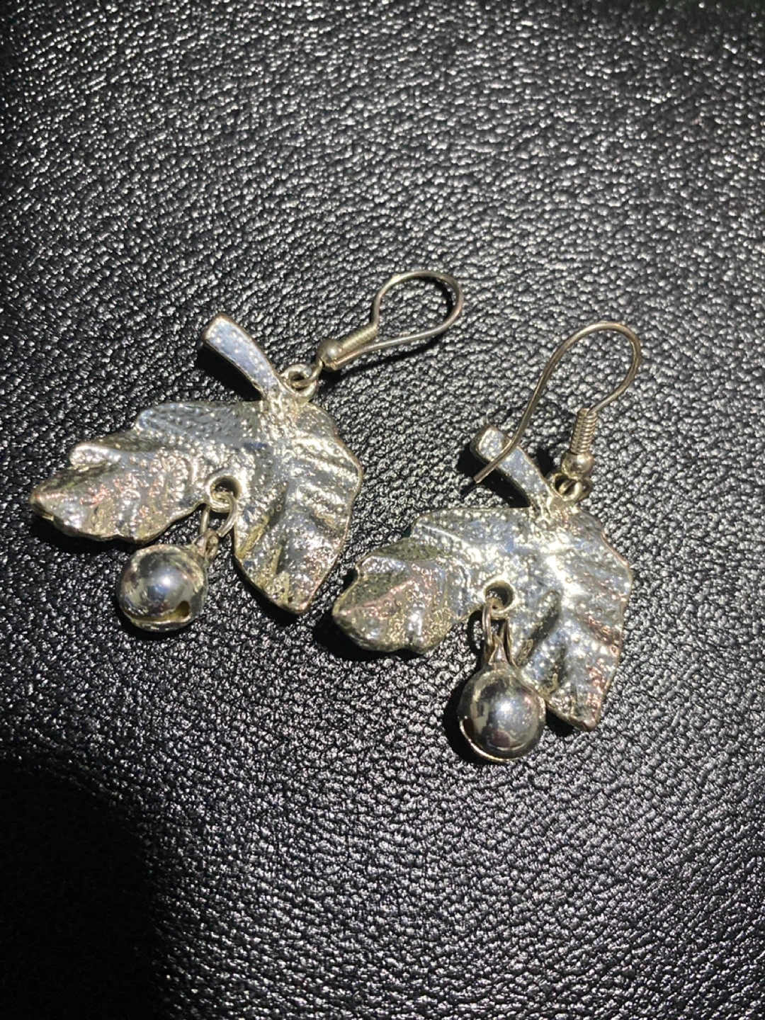 Cute green enamel leaf earrings with little silver bells. These dangly earrings feature a leaf design with a small bell dangling below. They're great for adding a playful touch to your outfit!