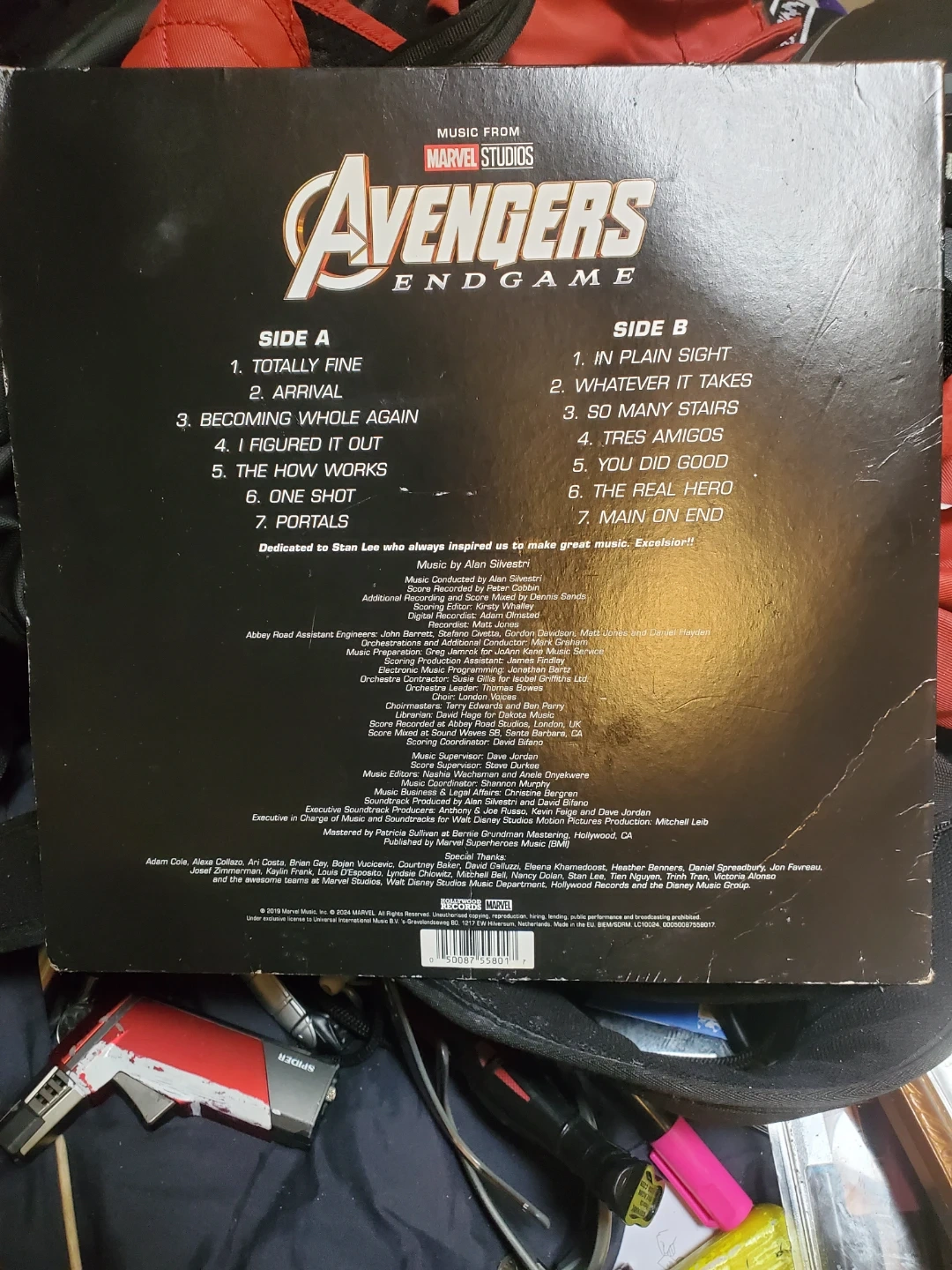 This is the original motion picture soundtrack for Marvel Studios' Avengers Endgame on vinyl. It features music by Alan Silvestri. The track list includes "Main On End", "Portals", and "The Real Hero".