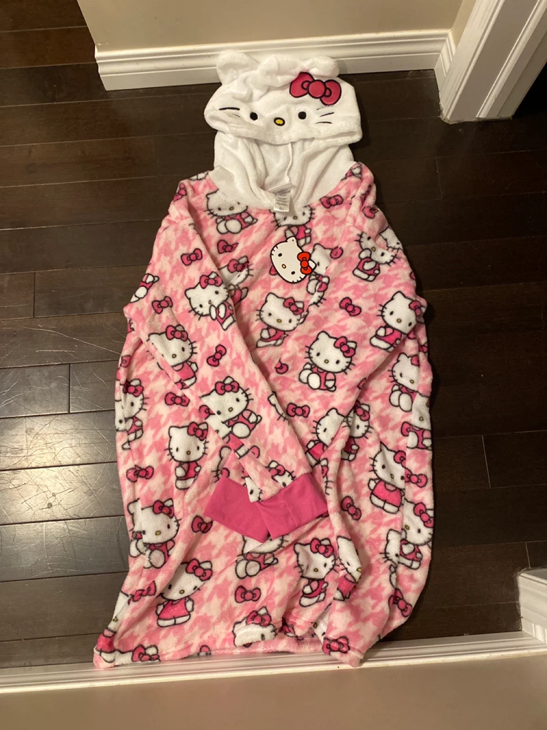Selling a super cute Hello Kitty hooded blanket robe! It's pink and white with an all-over Hello Kitty print. Perfect for lounging around the house on chilly days