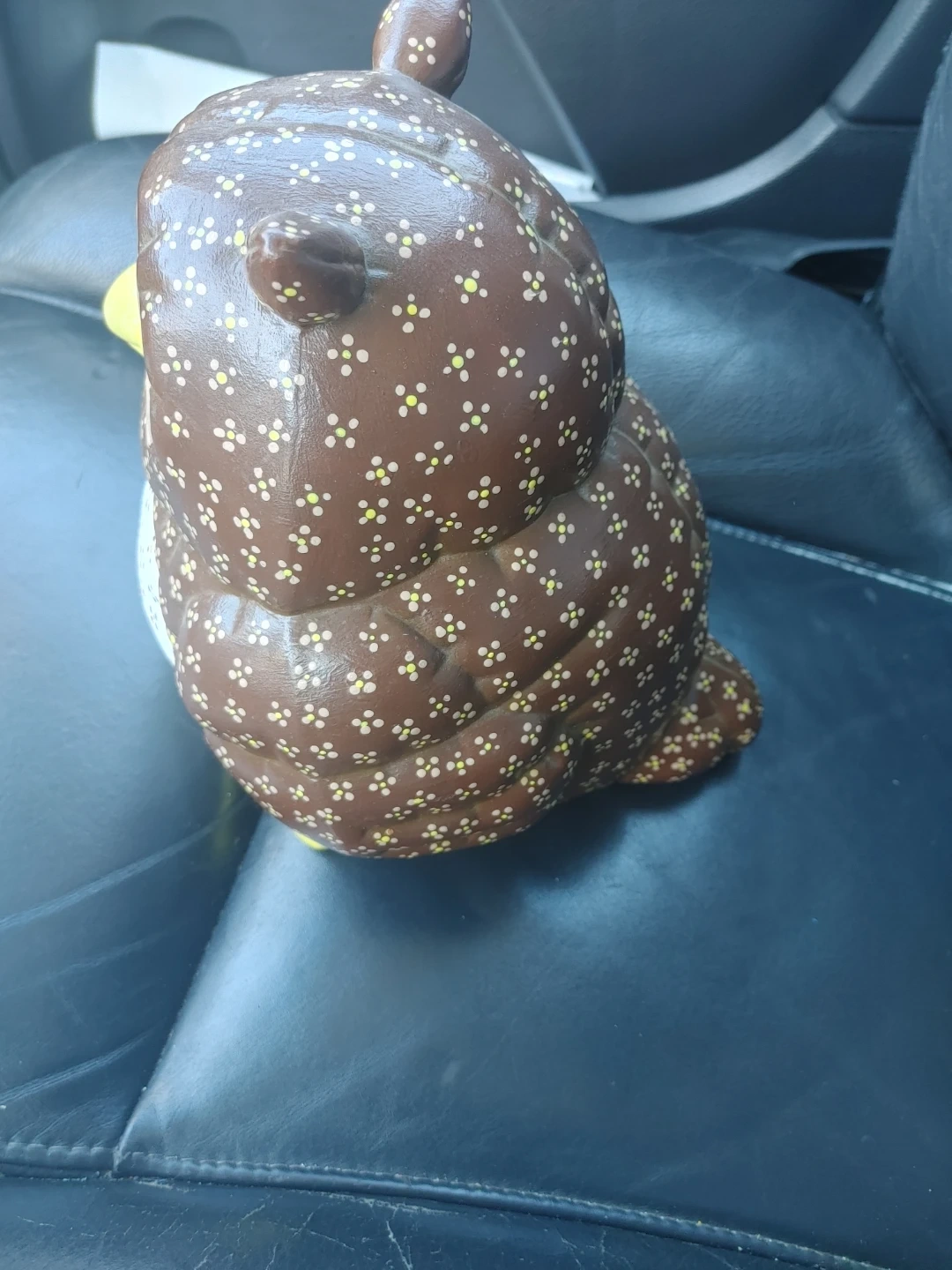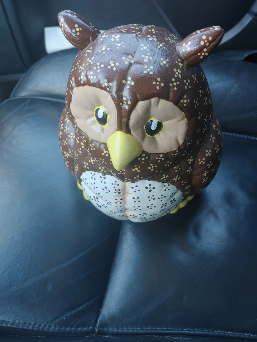 This is a cute brown ceramic owl figurine. It features a pattern of white and yellow dots all over its body. The owl has large, expressive eyes and a yellow beak. It's a charming decorative piece!