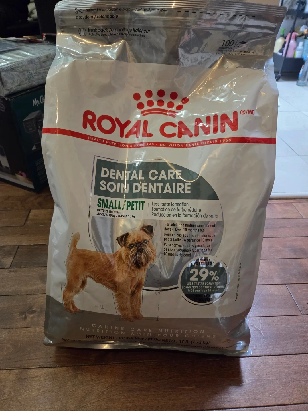This Royal Canin Dental Care food is for adult and mature small breed dogs over 10 months old. It's designed to reduce tartar formation by 29% in 28 days. The bag weighs 17 lb (7.72 kg).