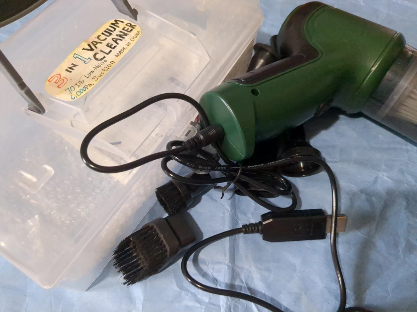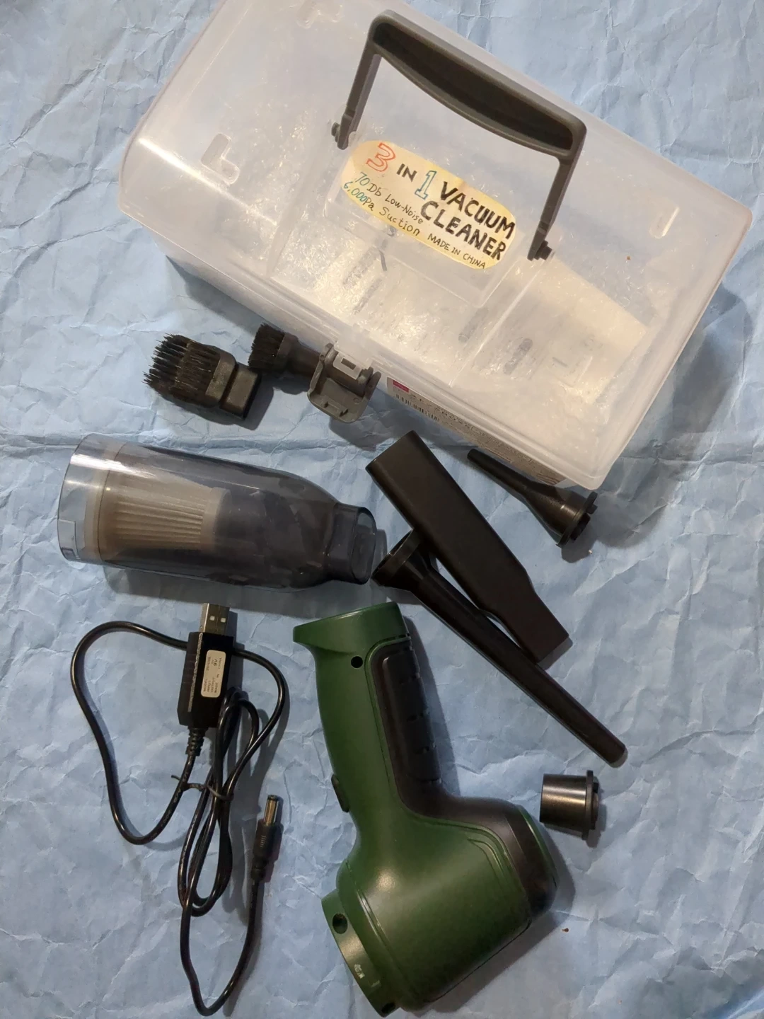 This 3-in-1 vacuum cleaner is green and comes with multiple attachments and a charging cable. It features a removable dustbin and filter. It's portable and easy to use for quick cleanups!