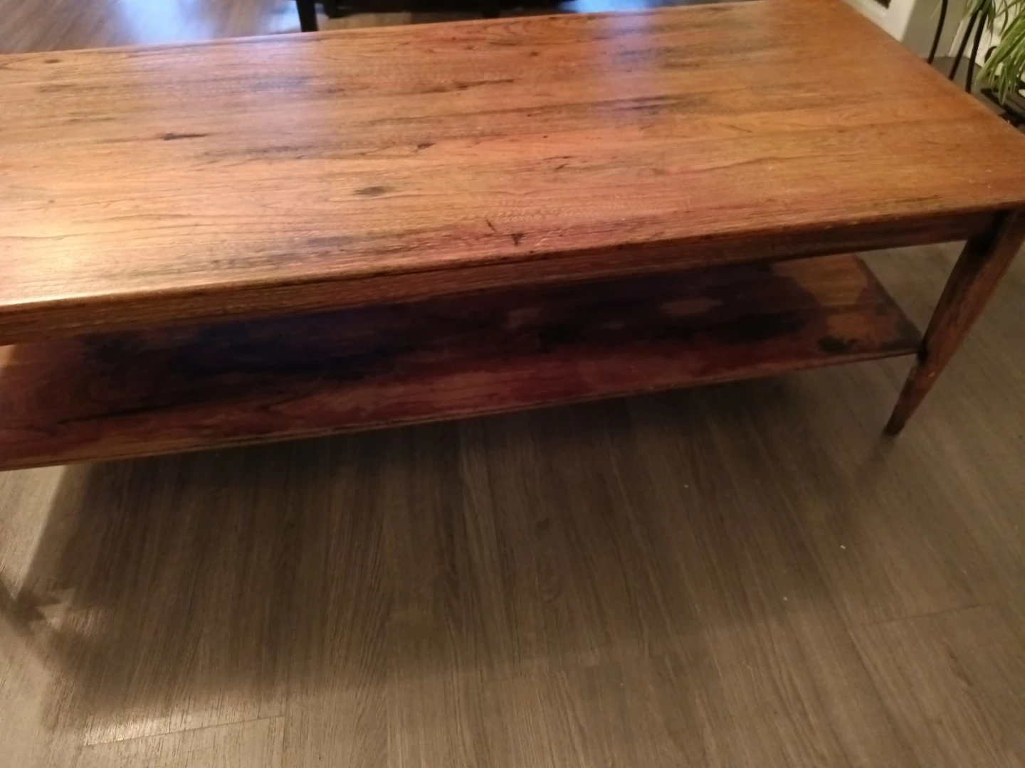 Selling a used wooden coffee table. It has a shelf underneath for extra storage or decor. It's a great piece for any living room!