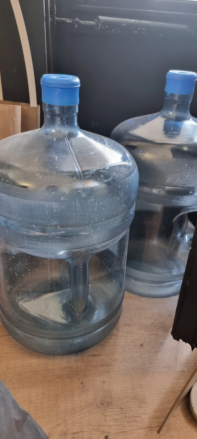 Selling two reusable 18.9-litre water cooler jugs with blue caps. These jugs are made of durable plastic and have built-in handles for easy carrying. They're perfect for standard water dispensers. Great for home or office use!