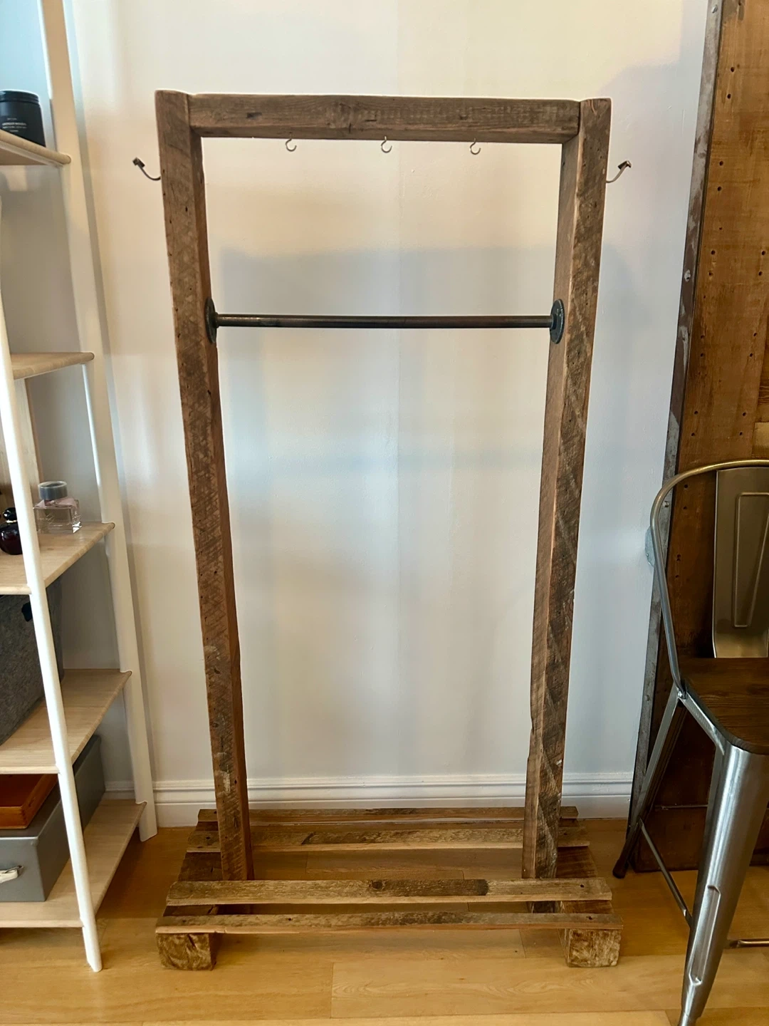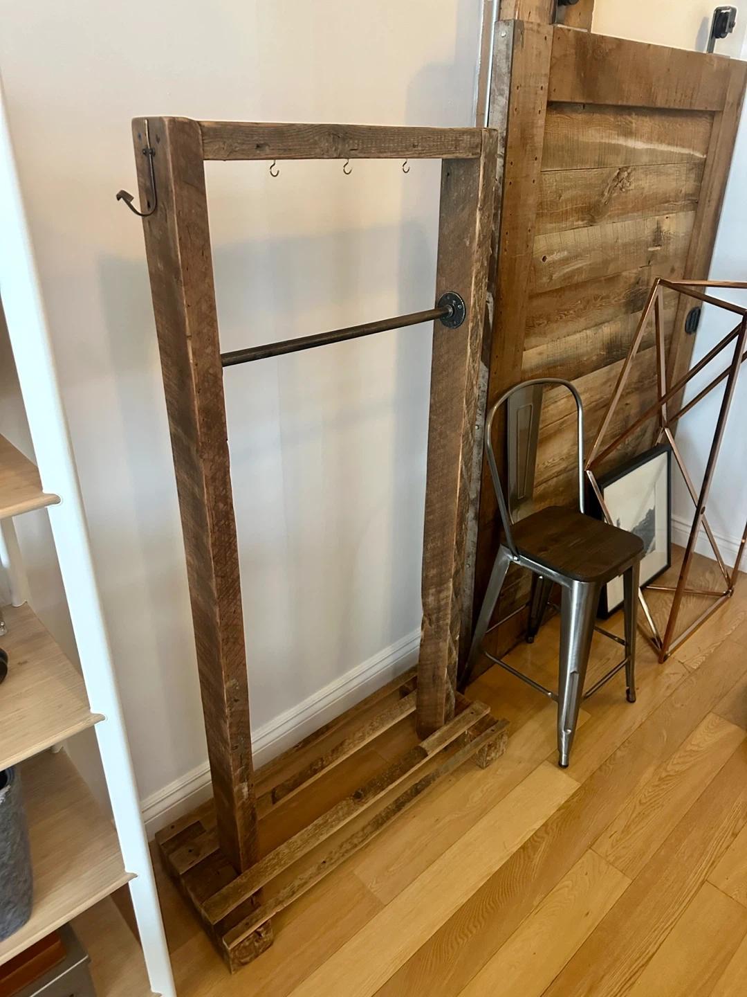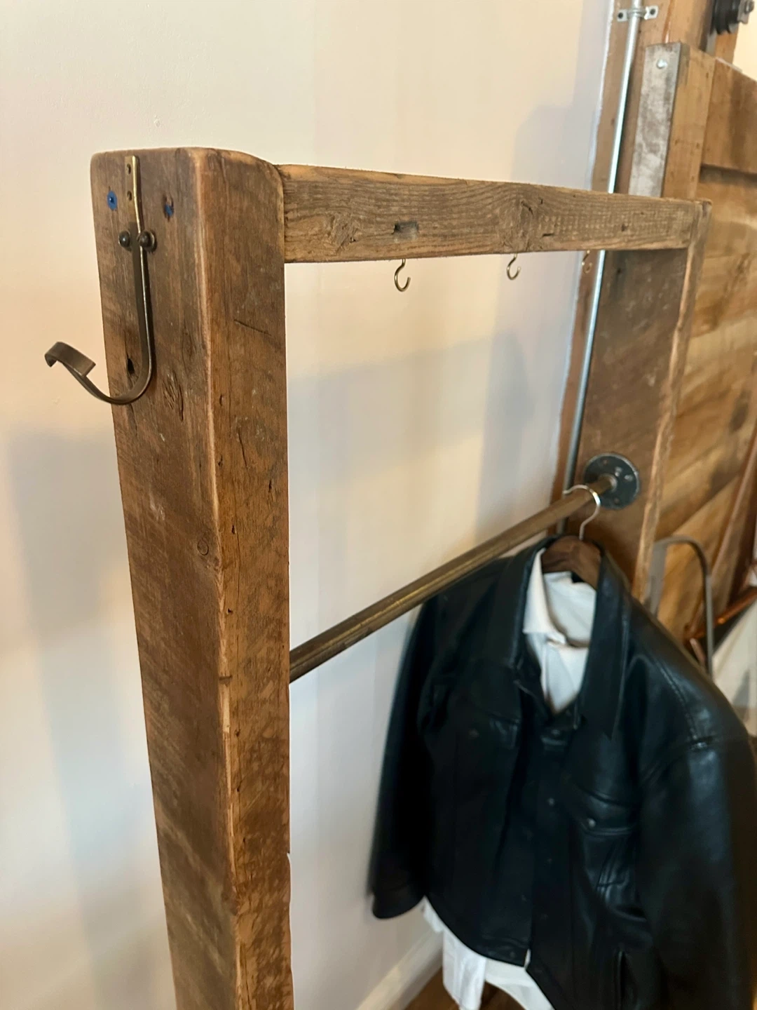 A great vintage pipe & century barn board clothing rack. Holds an amazing amount of stuff! Brass hardware.