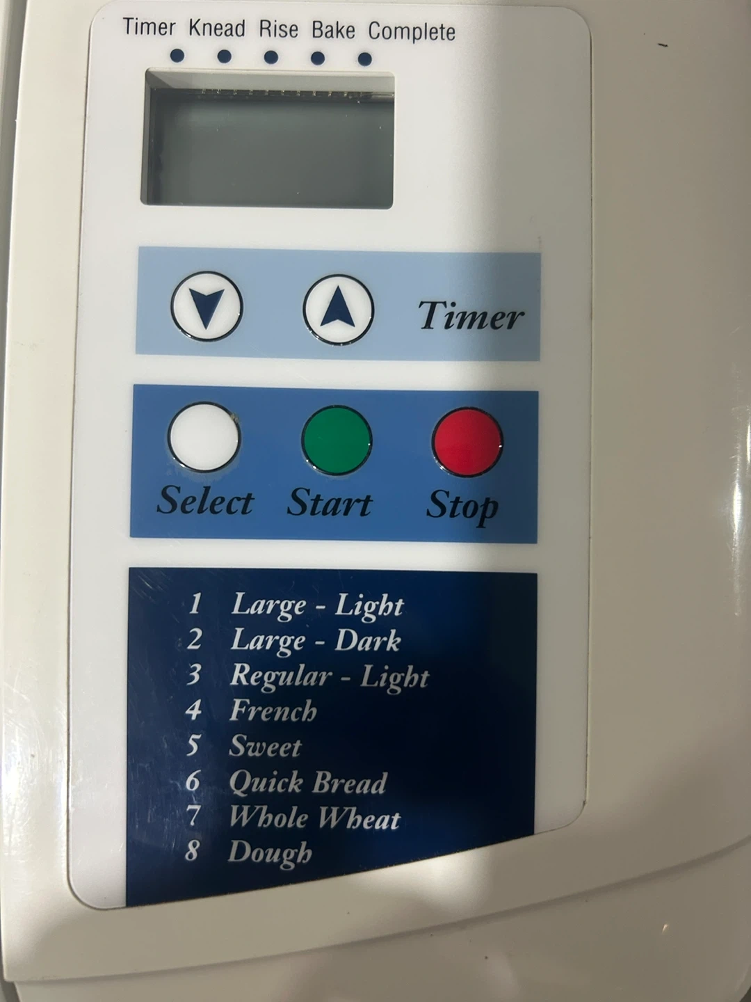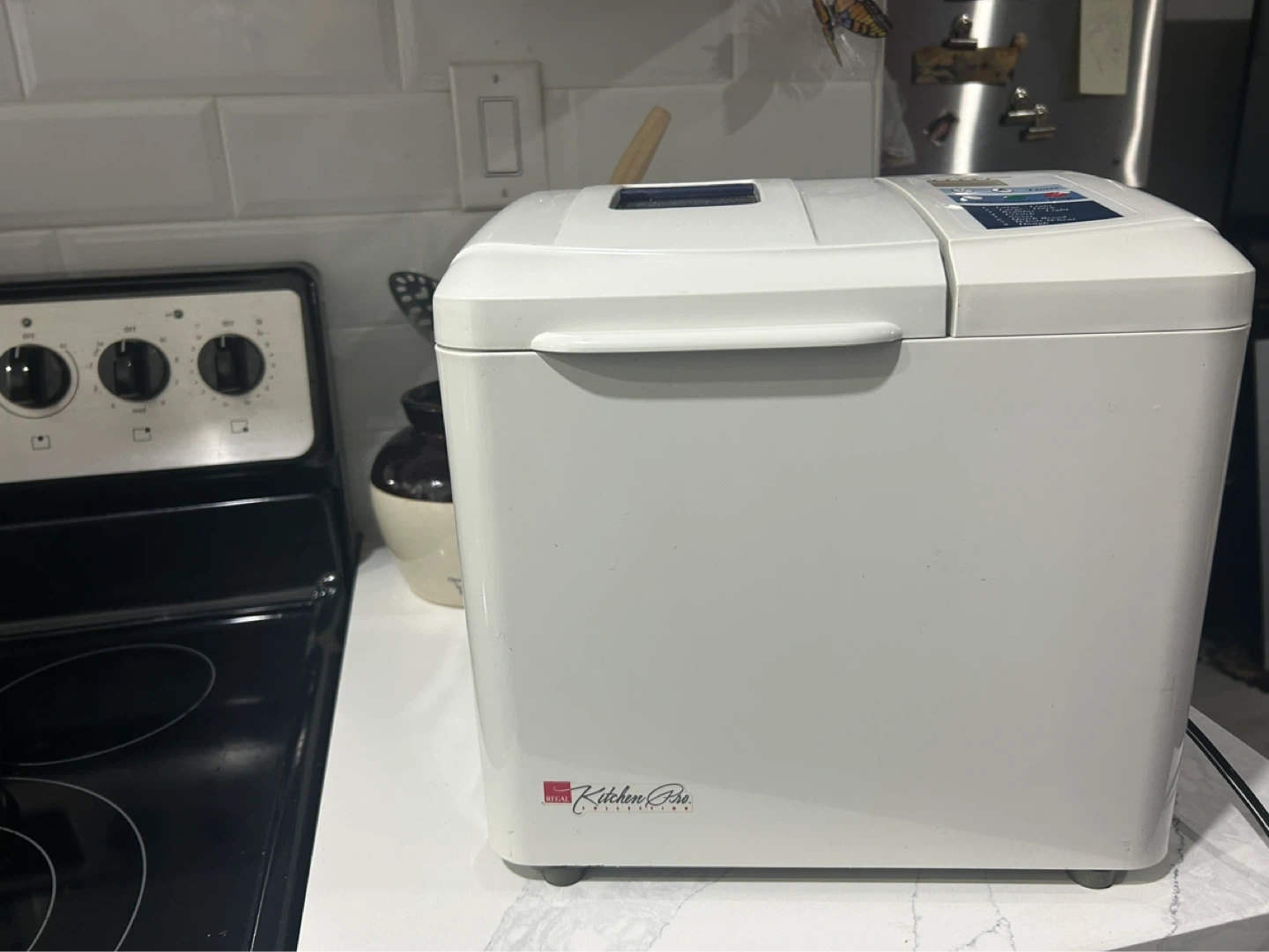 This white Kitchener Pro bread maker has multiple settings including timer, knead, rise, and bake. It offers options for large or regular loaves with light or dark crusts, plus sweet, French, quick bread, whole wheat, and dough cycles. It's perfect for baking fresh bread at home!