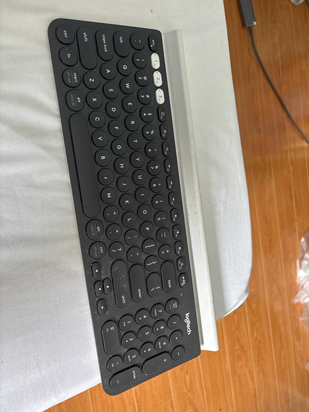 This is a Logitech wireless keyboard. It's powered by AAA batteries and connects wirelessly. It has a sleek black design with round keys. Missing the wireless dongle and back cover. Bluetooth still works.
