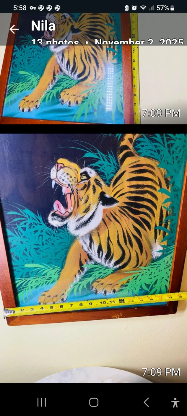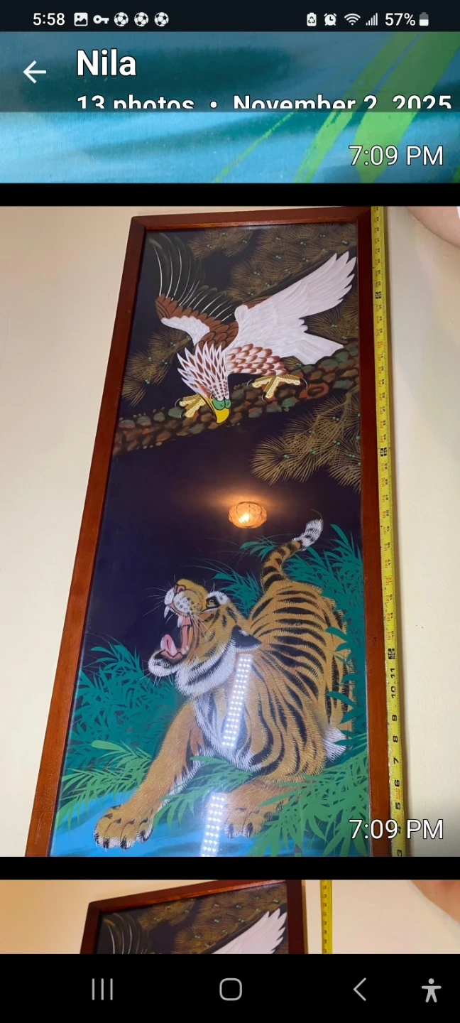 Selling a framed wall art painting featuring a tiger and an eagle. It measures approximately 44 inches in height and 12 inches in width. Perfect for adding a unique touch to any room!
