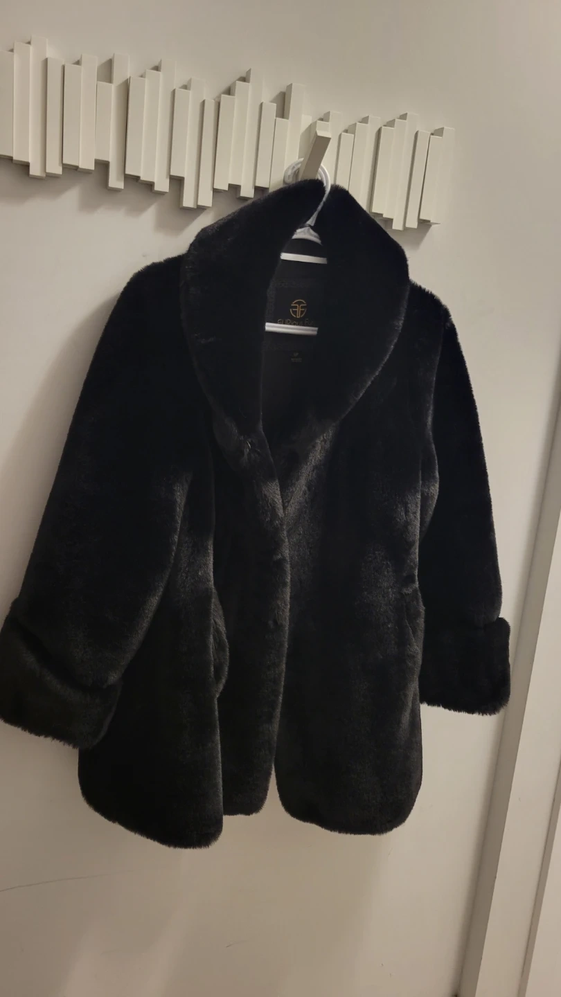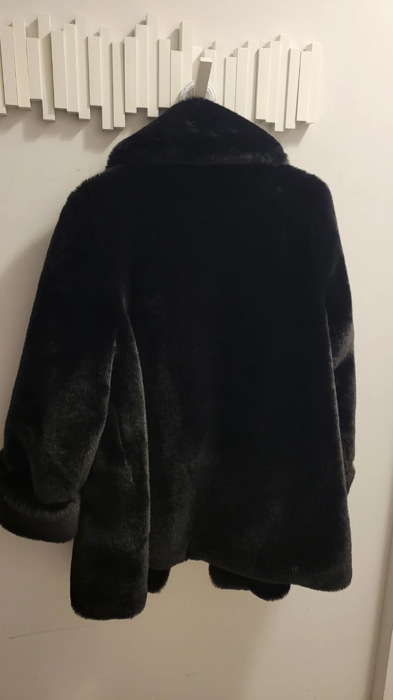 This black faux fur coat has a stylish shawl collar and a relaxed fit. It's a cozy and chic layering piece for cooler weather. This jacket is made from soft, plush material. Fits medium too.