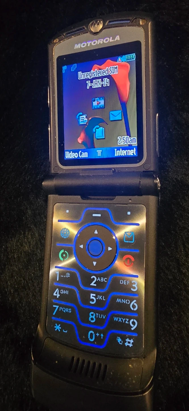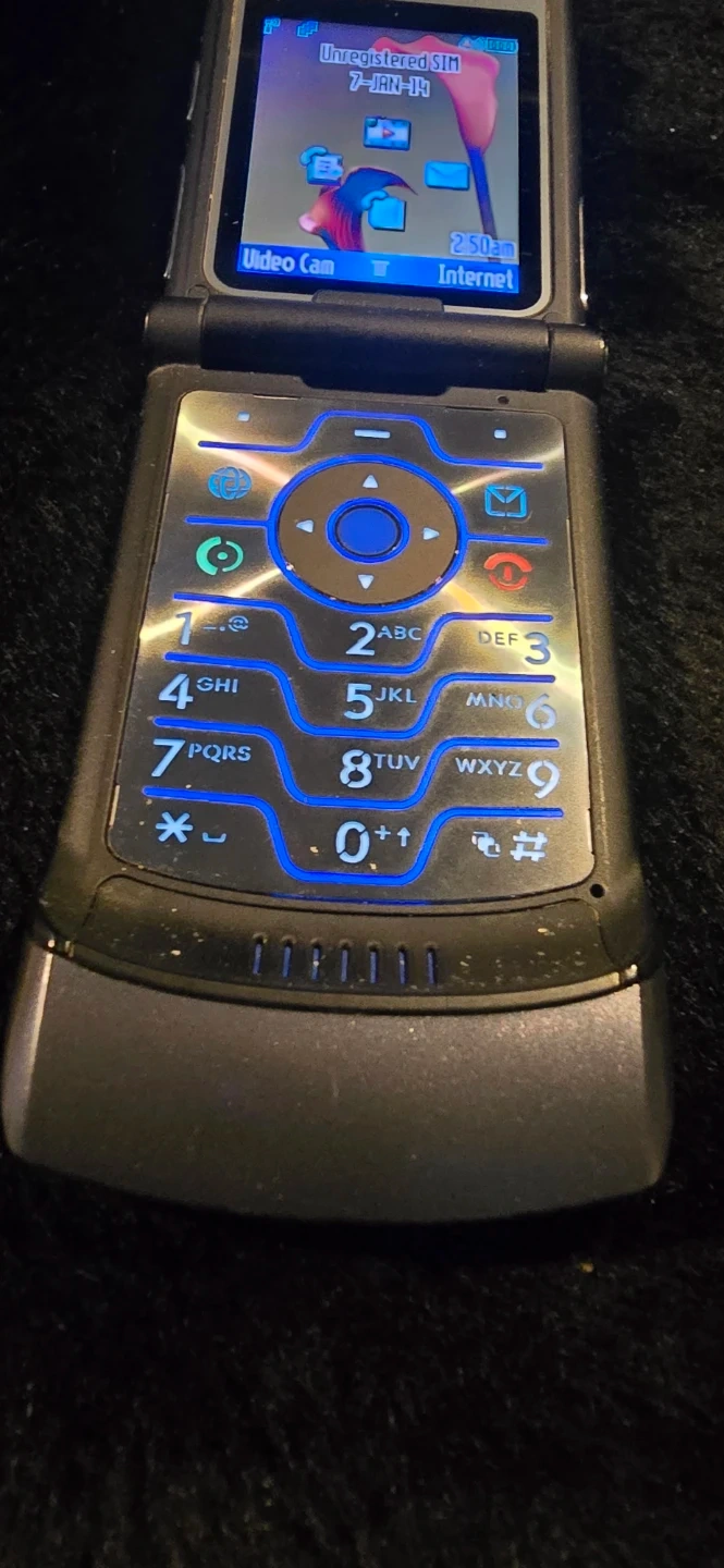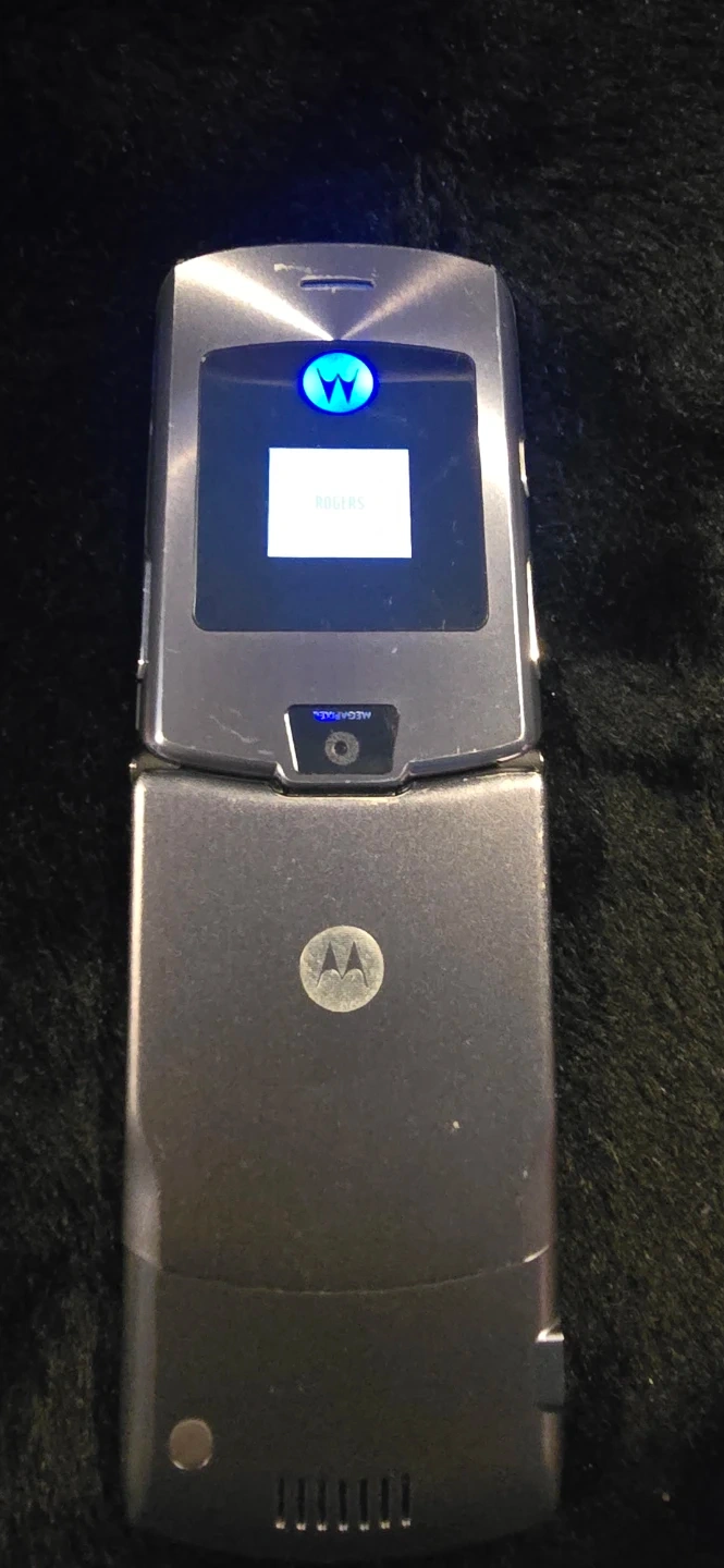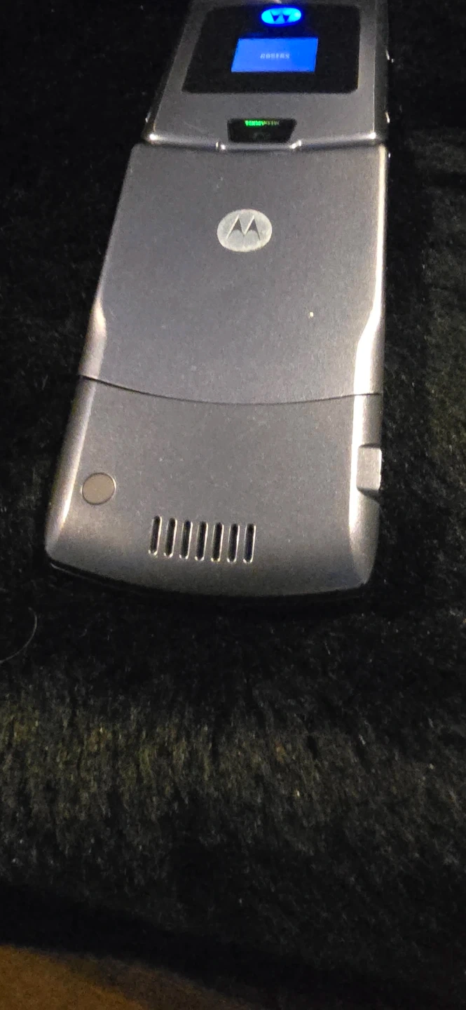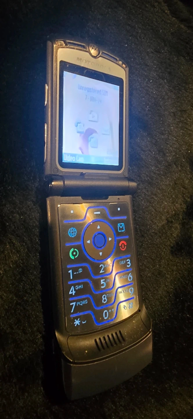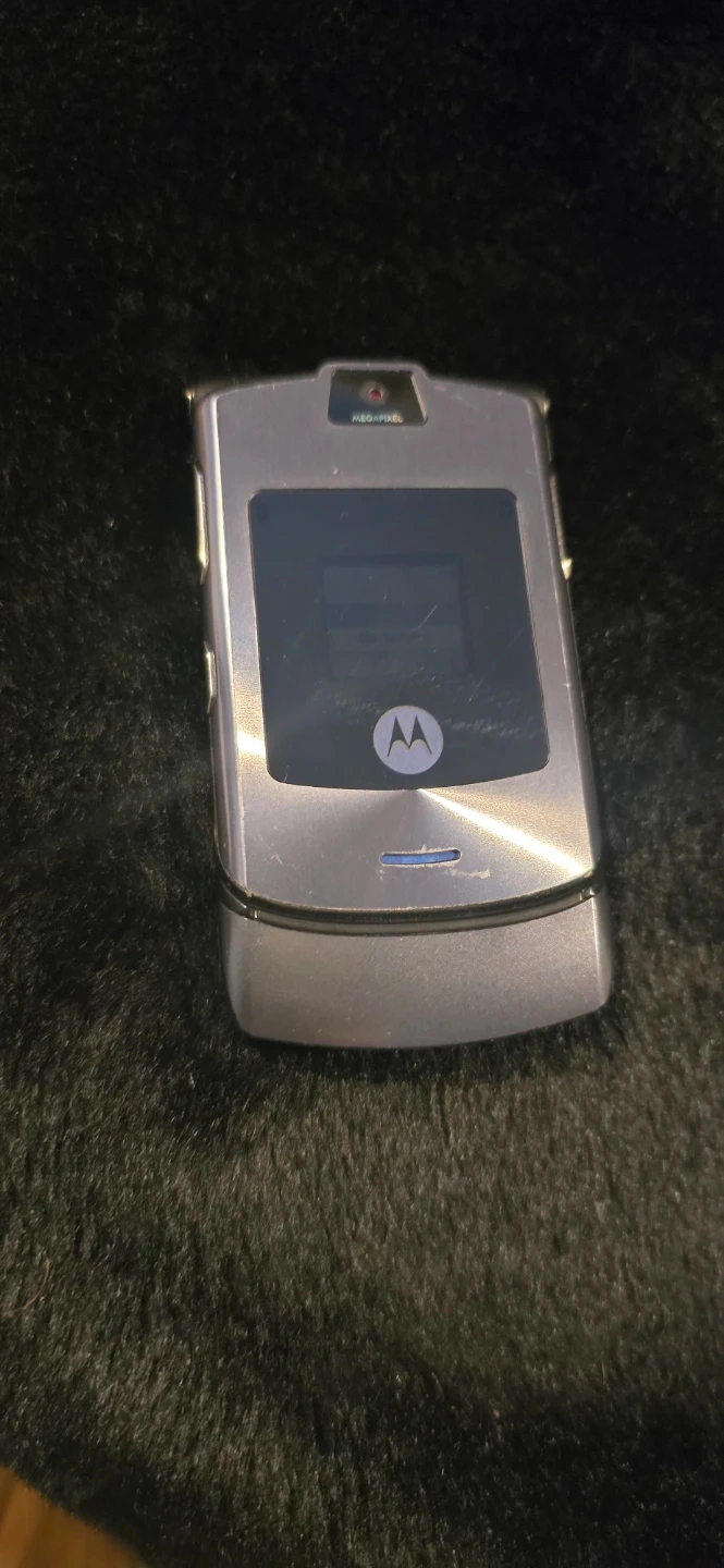 This is a classic Motorola RAZR V3 flip phone in grey. It's a durable and stylish device, perfect for basic calls and texts. It features a clear display and illuminated keypad for easy use.